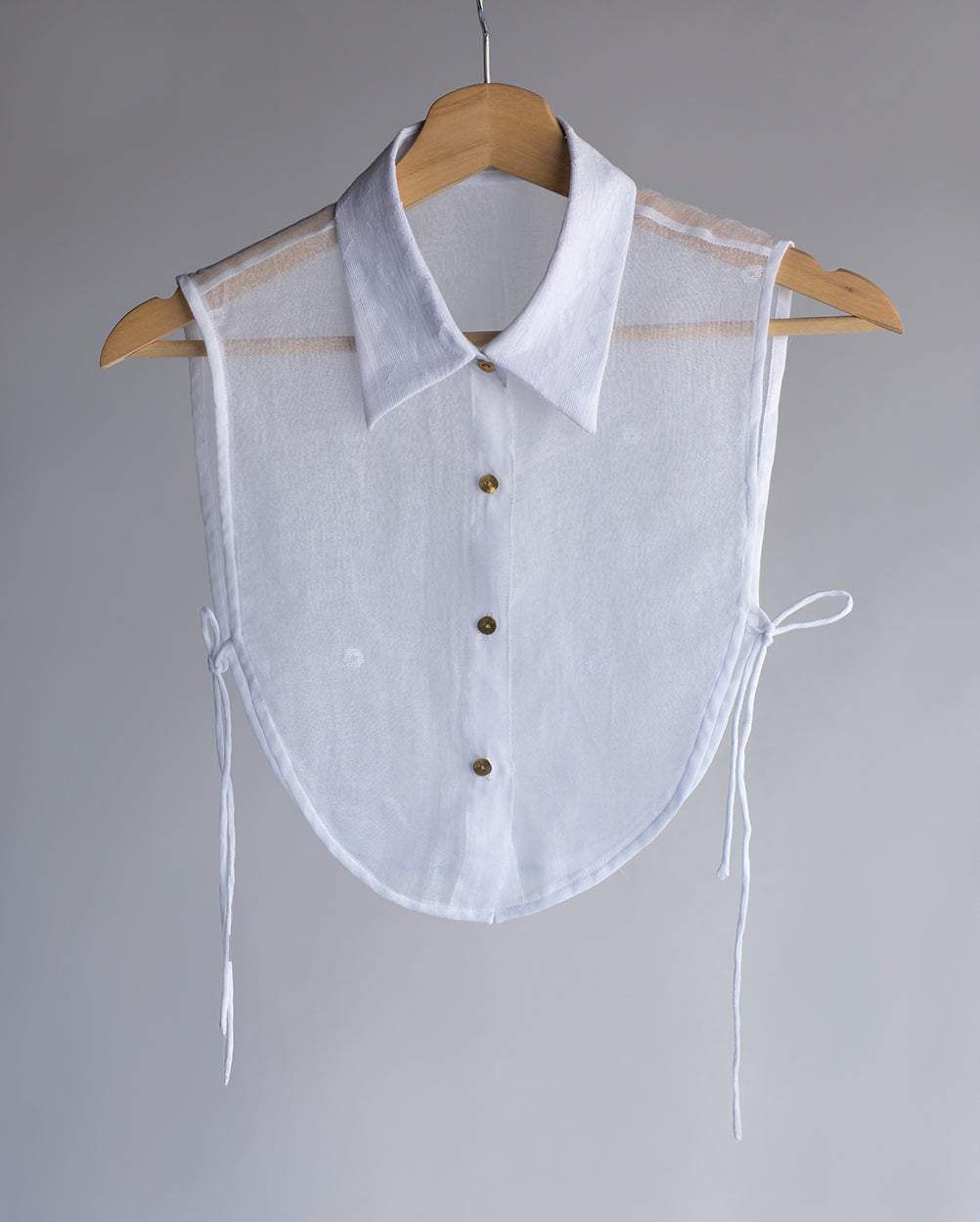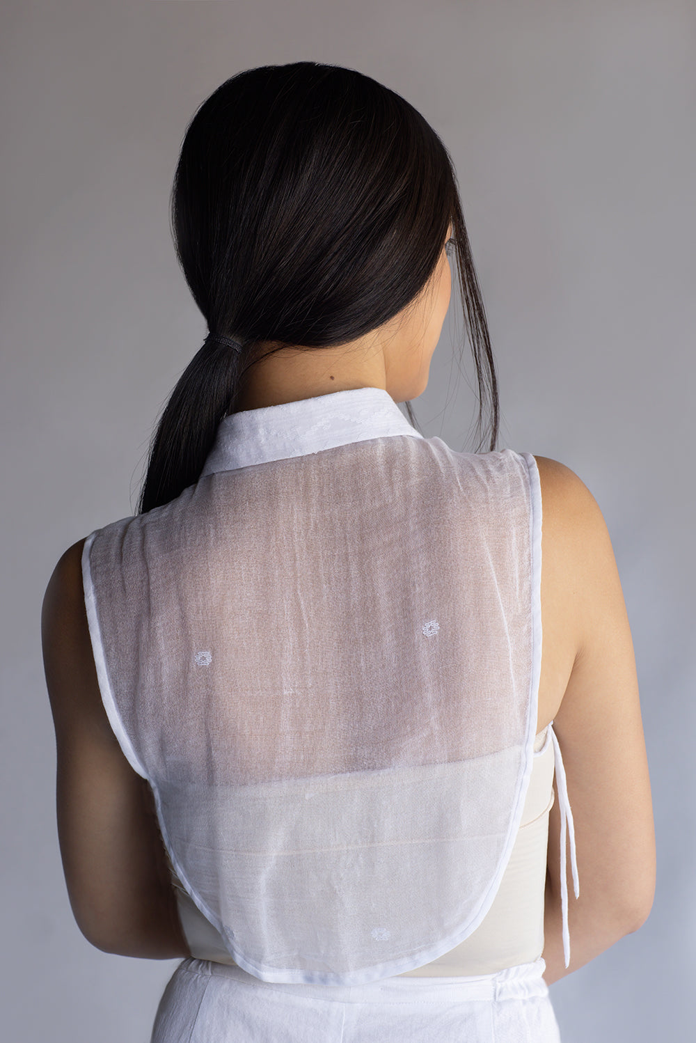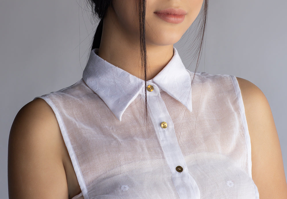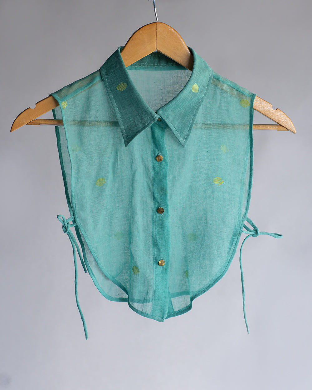 Detachable collar hand-crafted from traditional Wangkhei phee/Jamdani Fabric. Rounded edges and golden beaten metal buttons in front.