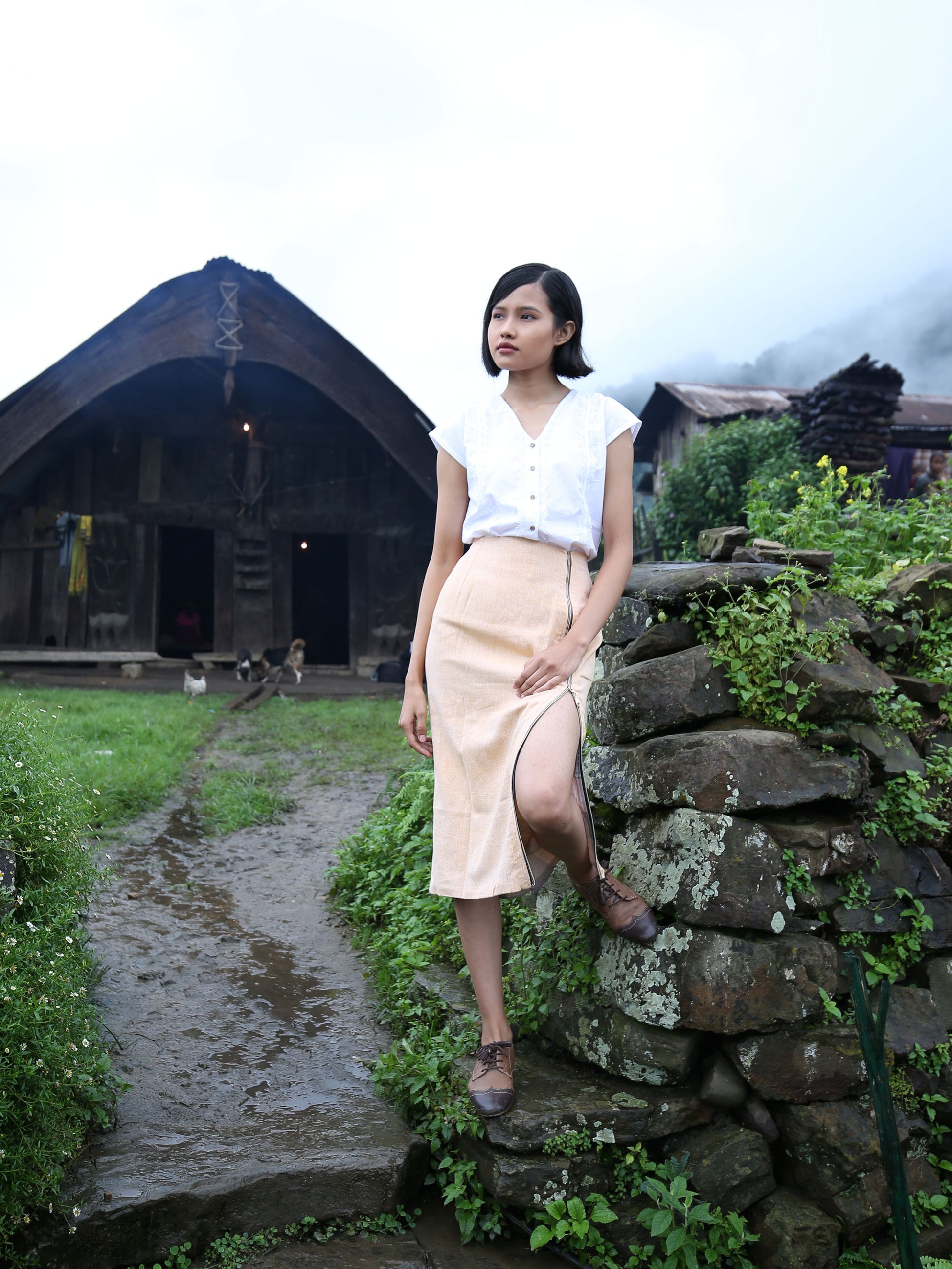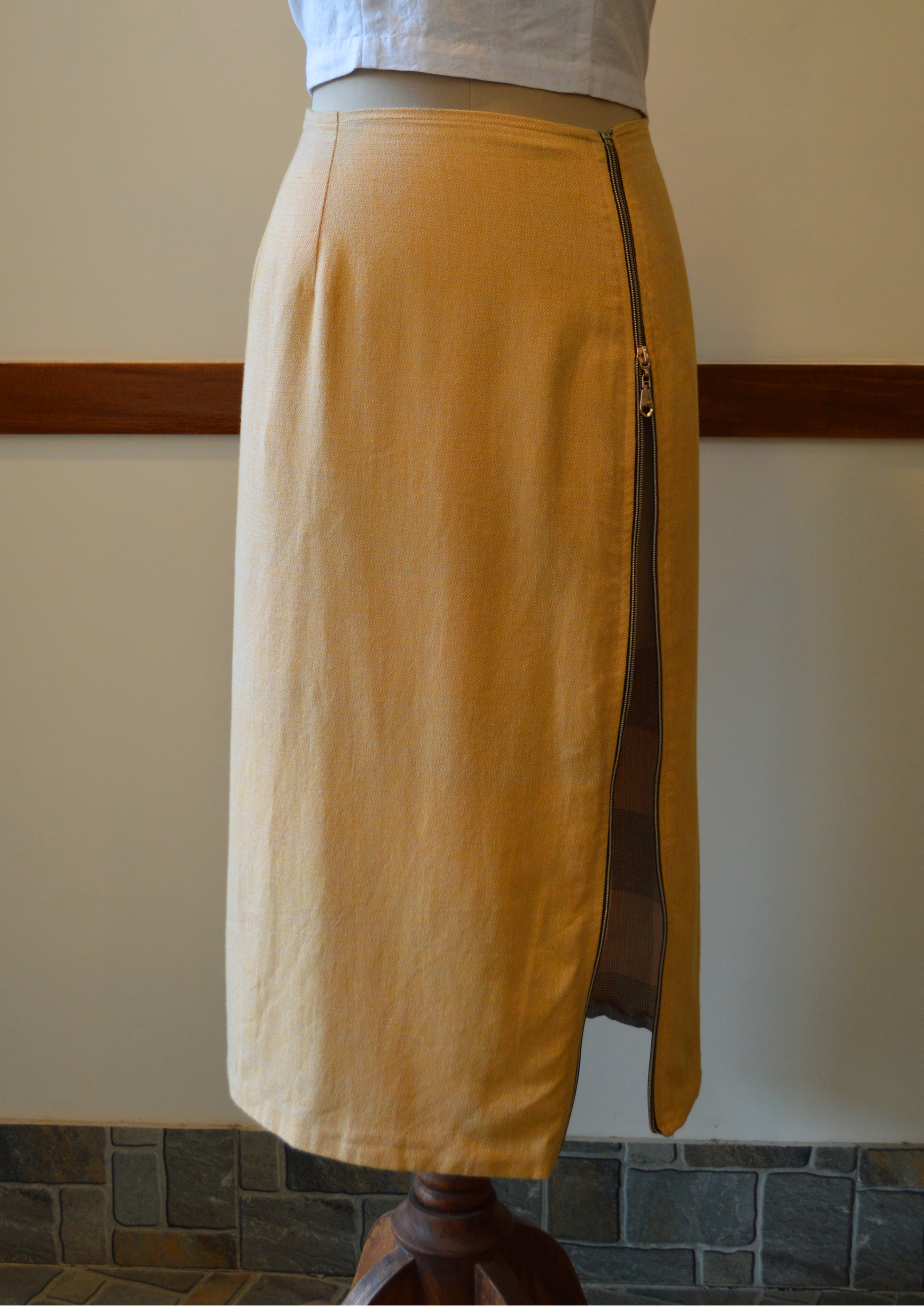 A sleek, straight-fit midi skirt woven in Heikoi Mayek (Diamond twill pattern). Embellished with long metallic zipper running down the front, allowing a high slit to open as bold or as subtle as you choose.