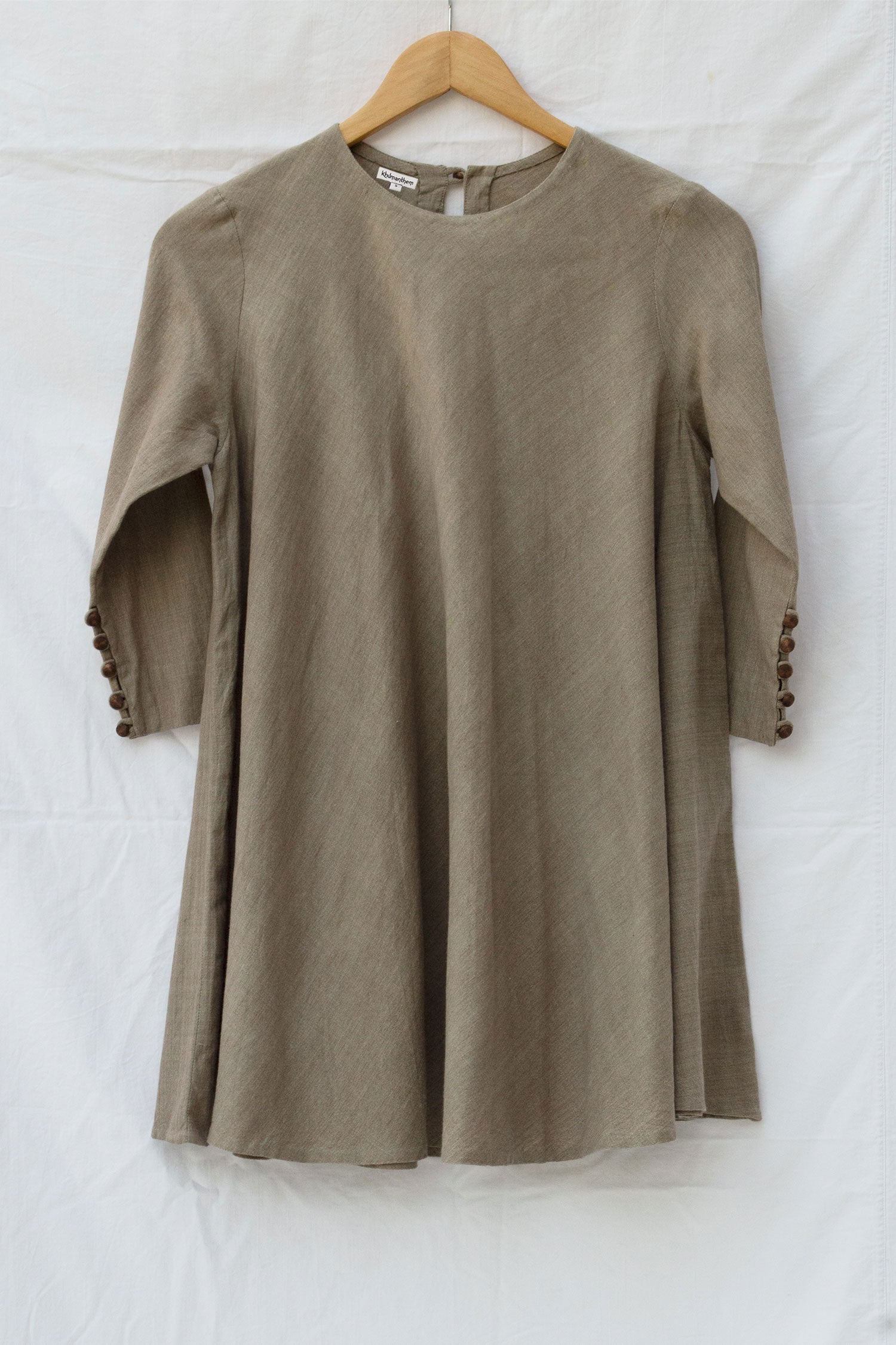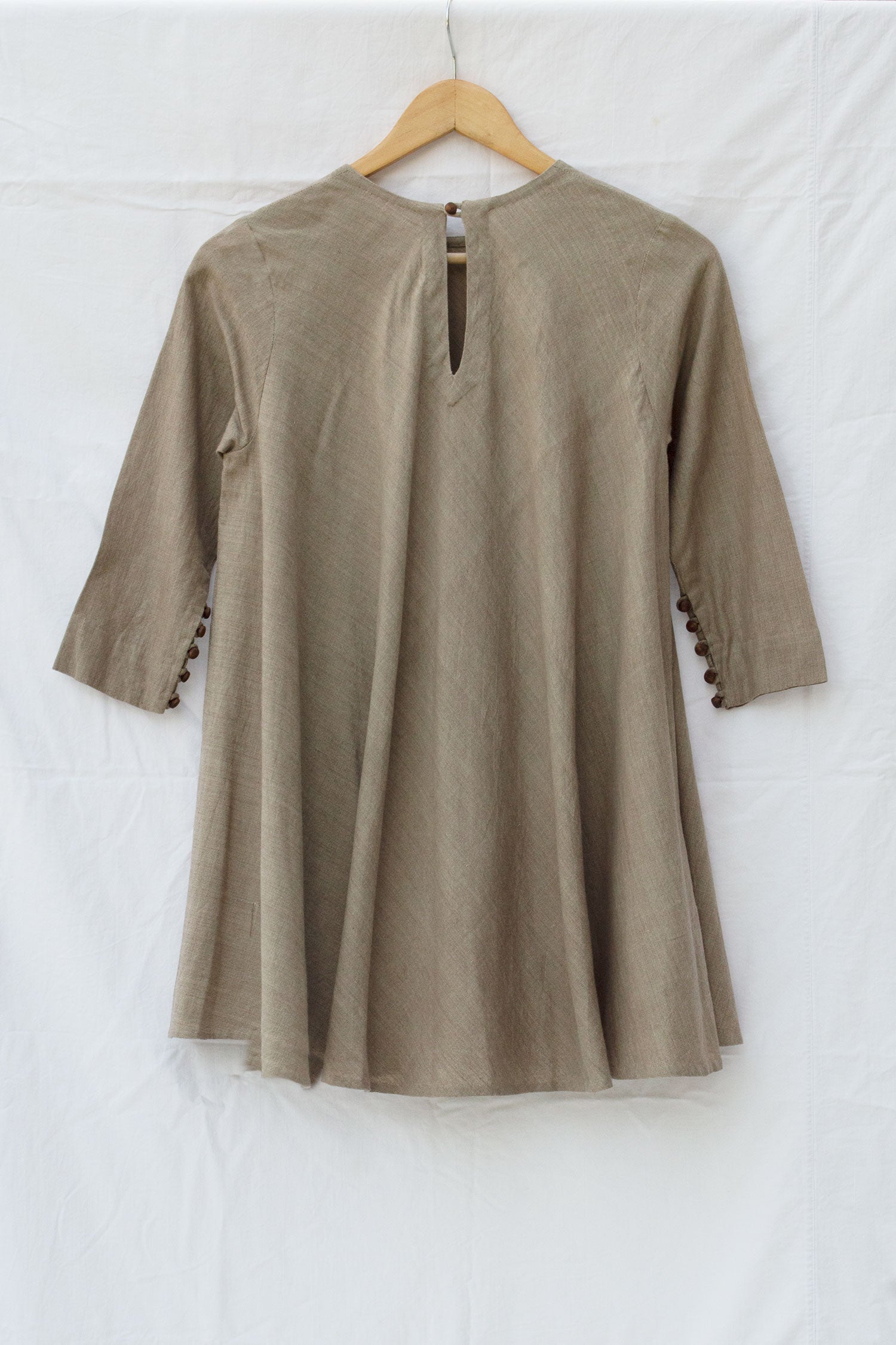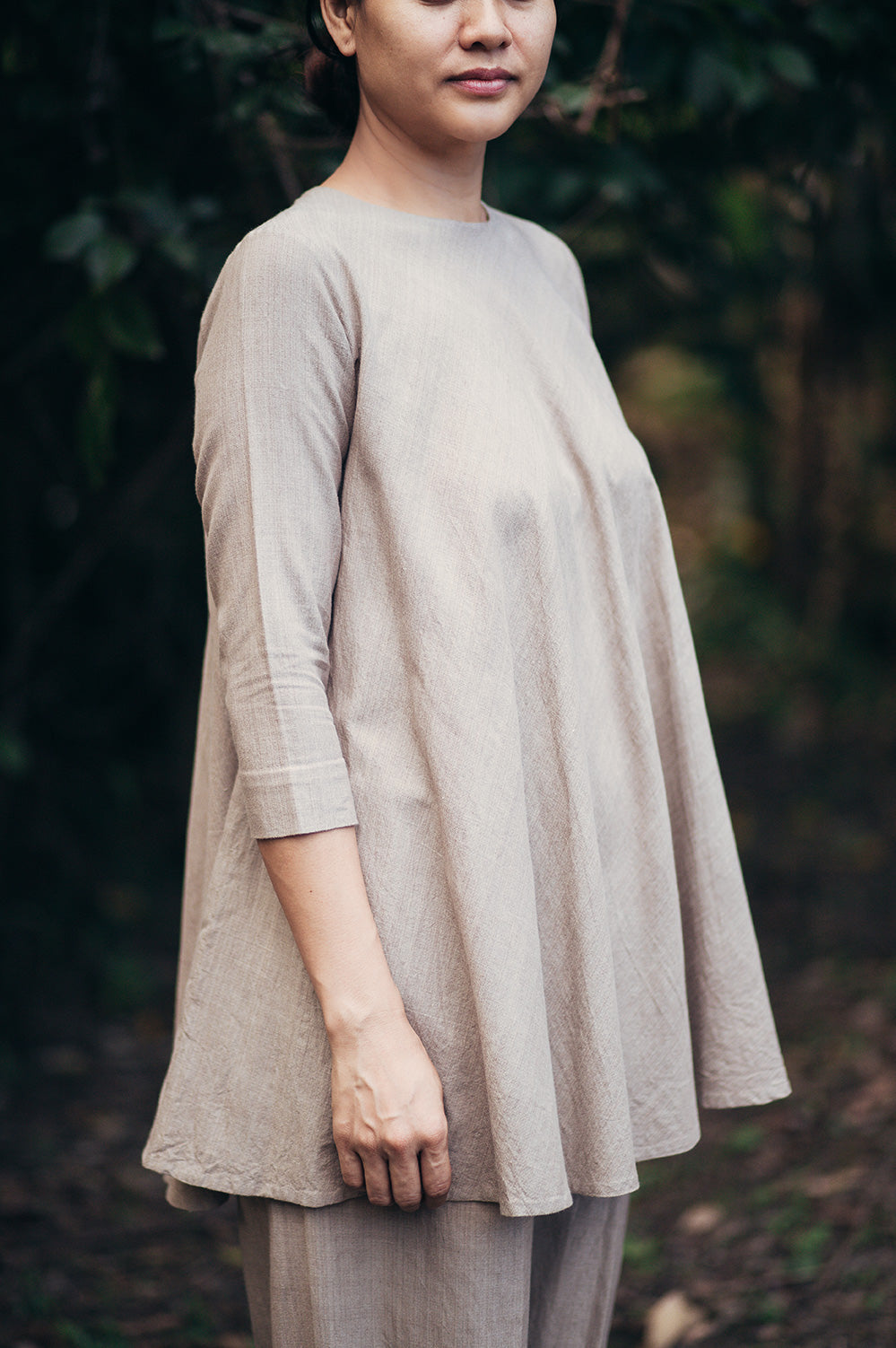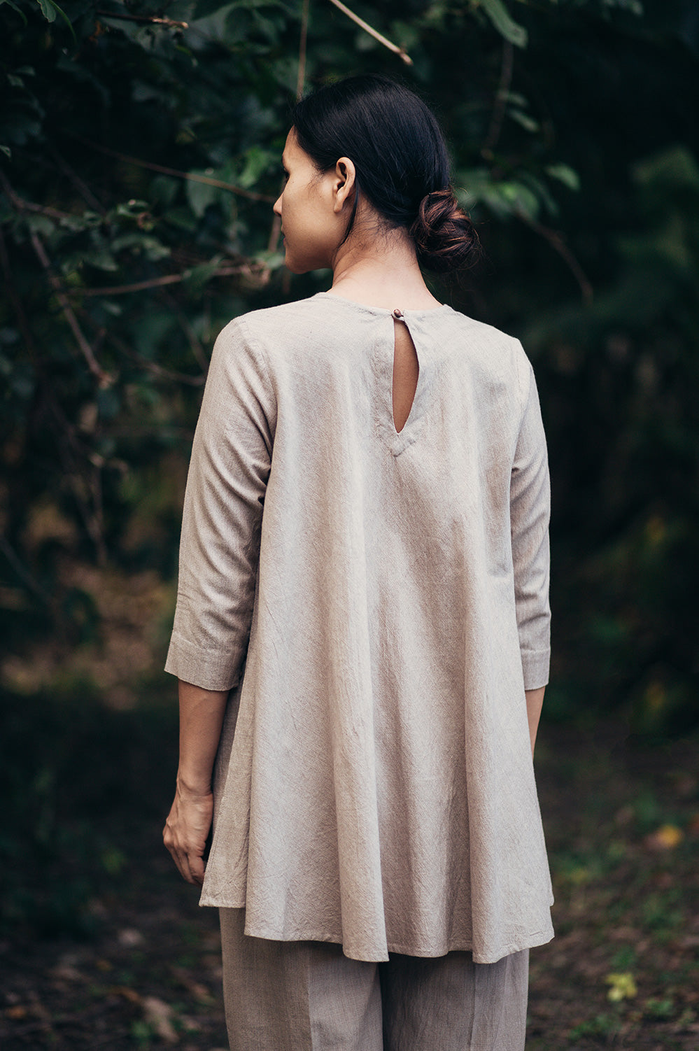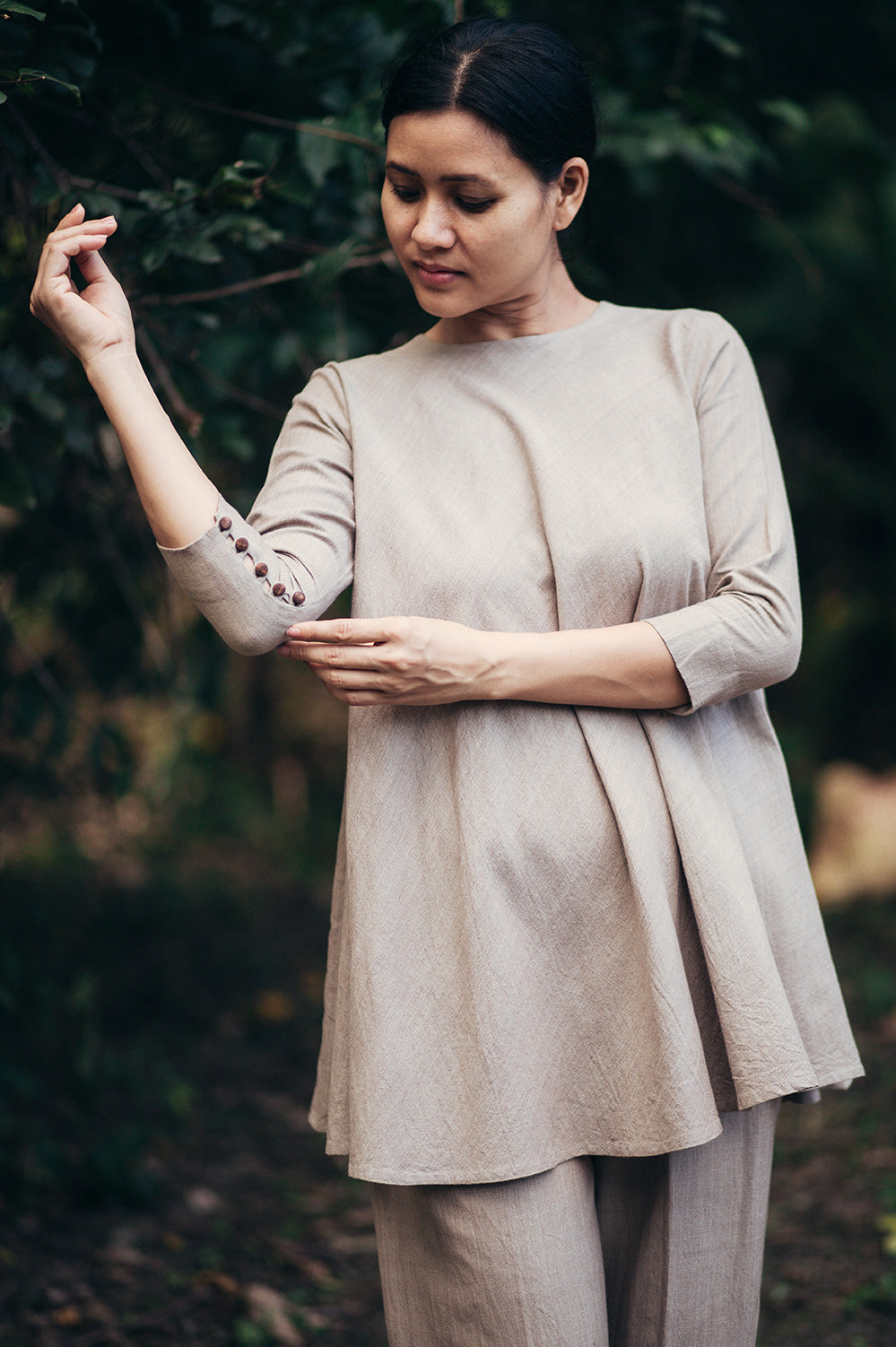 Cut to drape with ease, the Earth Top features quarter-length sleeves finished with wooden buttons, subtle nods to nature’s texture. A silhouette that embraces movement and simplicity.