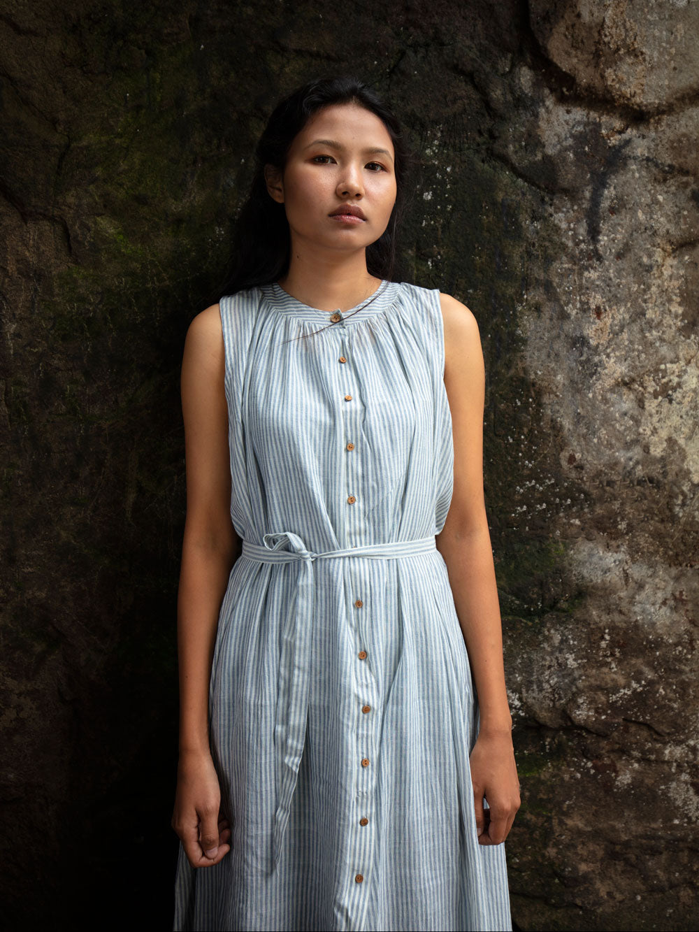 This airy, sleeveless striped tunic dress is crafted from breathable cotton in soft shades of blue and white. Featuring delicate gathers at the neckline, a button-down front, and a fabric belt that cinches the waist, it blends elegance and comfort for effortless summer dressing.
