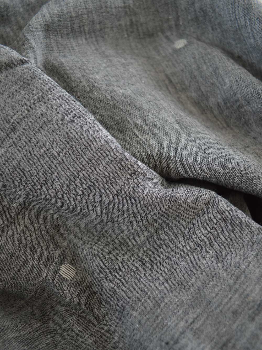 This is a full-length, relaxed-fit grey handwoven cotton dress with subtle white butti scattered throughout. It features a high V-neckline and a central row of looped wooden button closures, adding a handcrafted, almost vintage oriental touch. The sleeves are full-length and loose, contributing to the airy, breathable appeal of the garment.Material: Handwoven cotton. Comes with a Camisole.