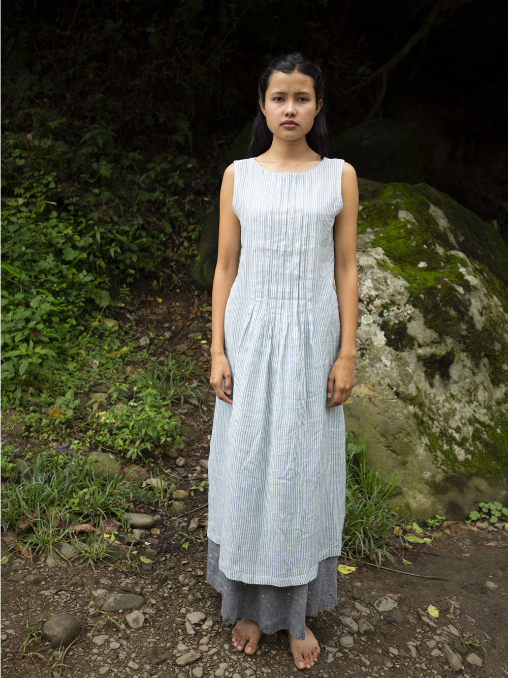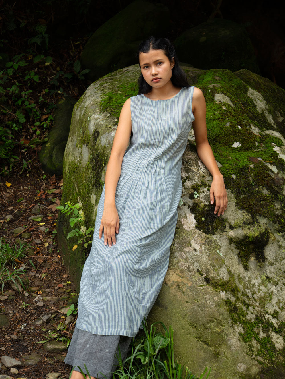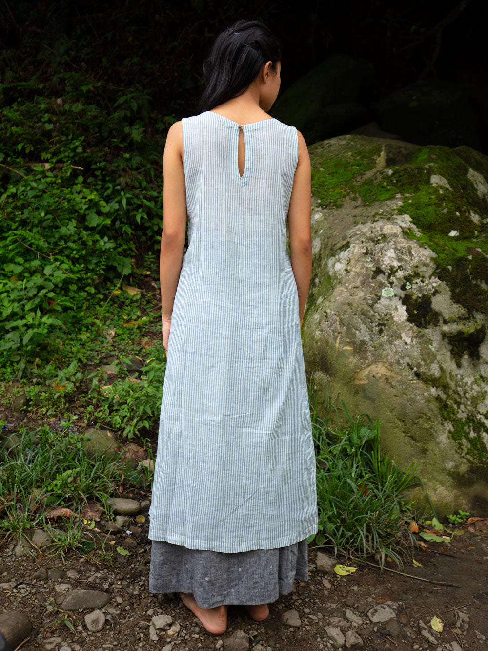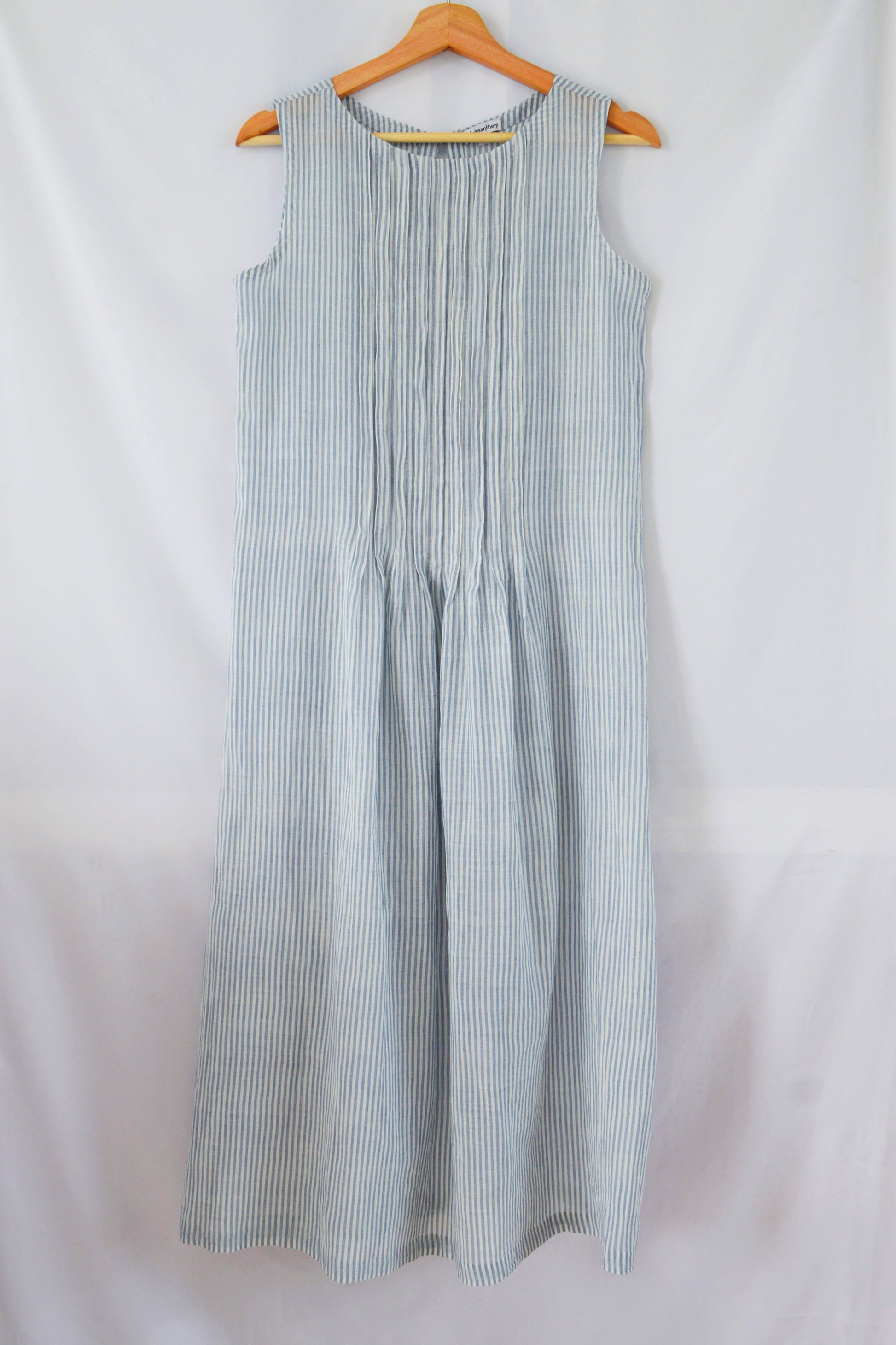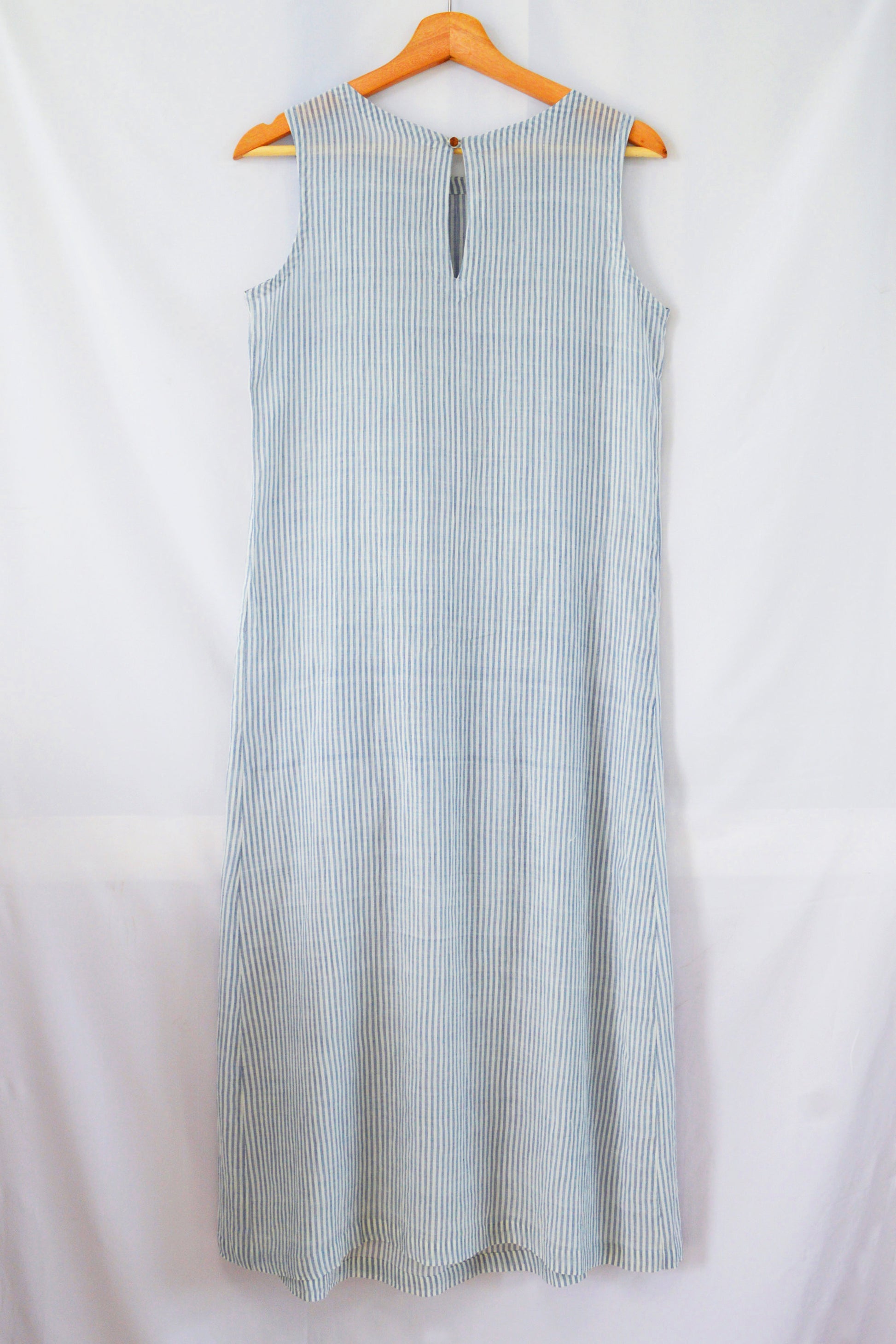 Sleeveless midi dress featuring soft vertical blue and white stripes, keyhole opening at the back and delicate pleats along the bodice that gently open at the waist for a flattering, relaxed silhouette. Comes with a Camisole.