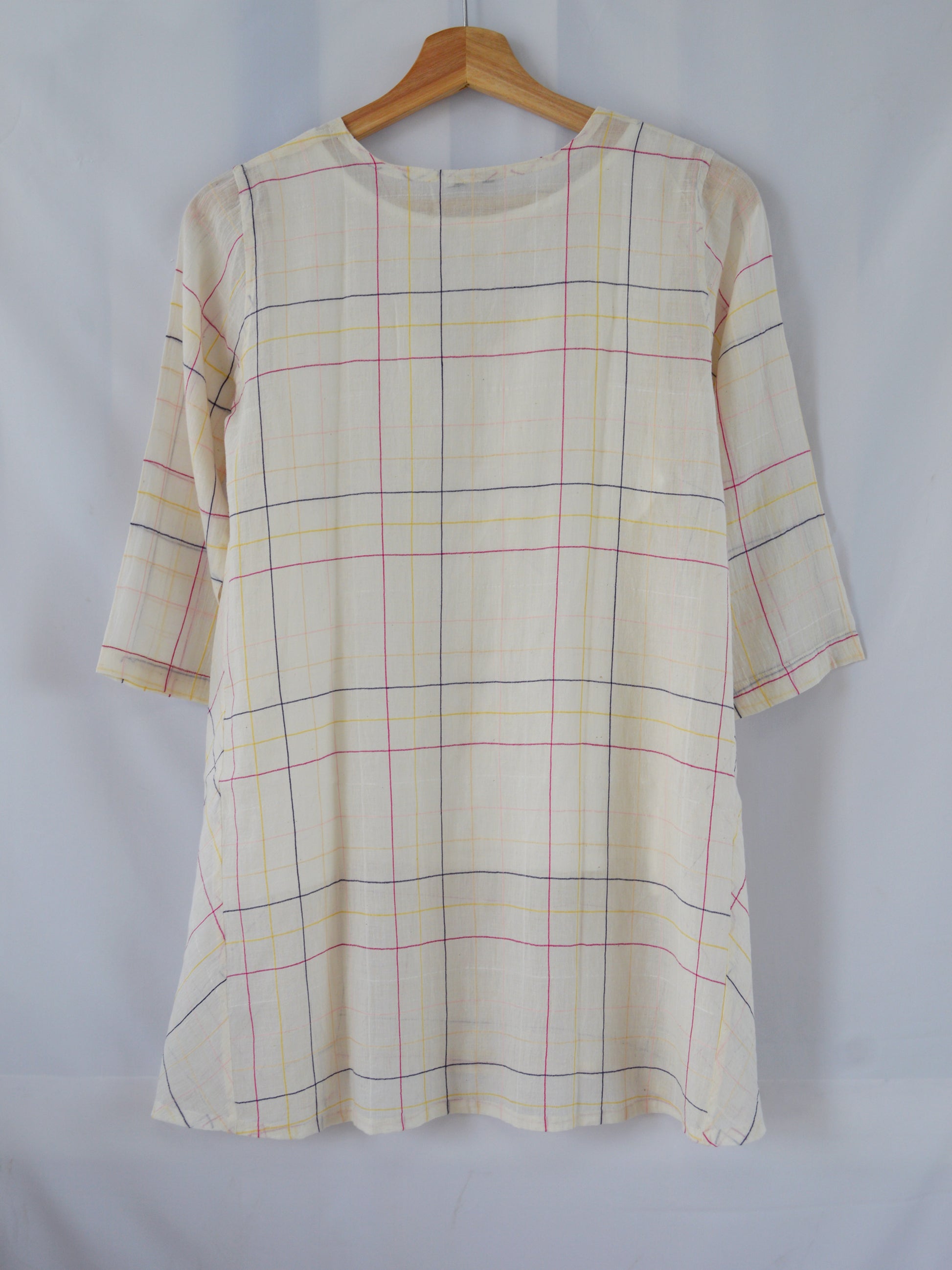 A relaxed-fit, A-line tunic crafted in a lightweight handwoven cotton with a soft off-white base and colourful windowpane checks in red, yellow, and navy. Featuring a round neckline with a keyhole detail and 3/4th sleeves, the silhouette is gently flared for added ease of movement.