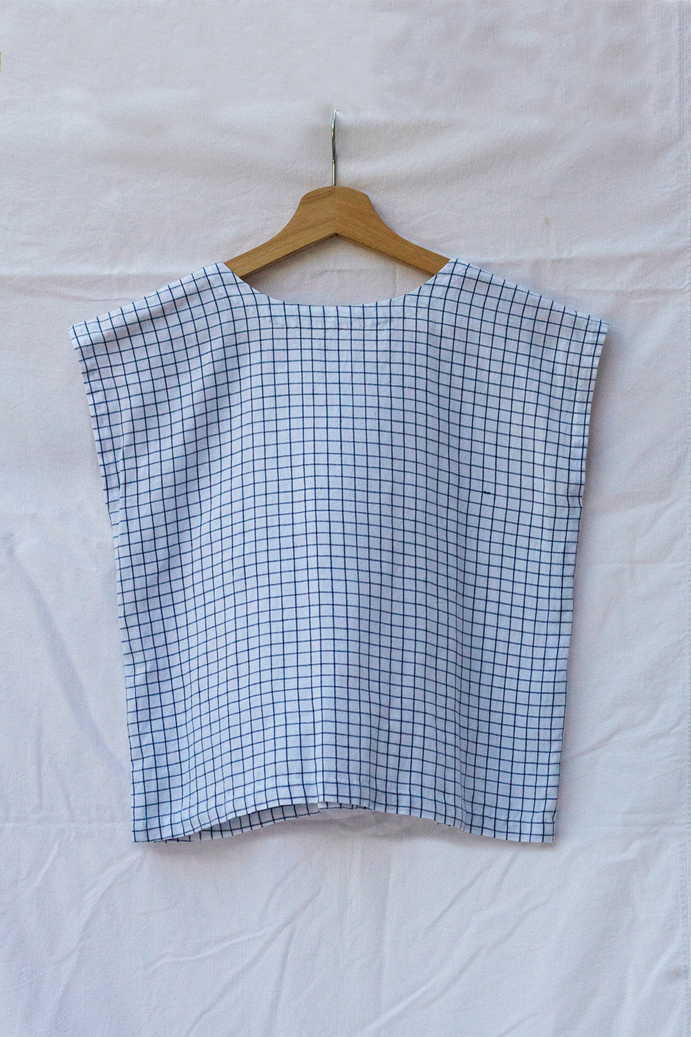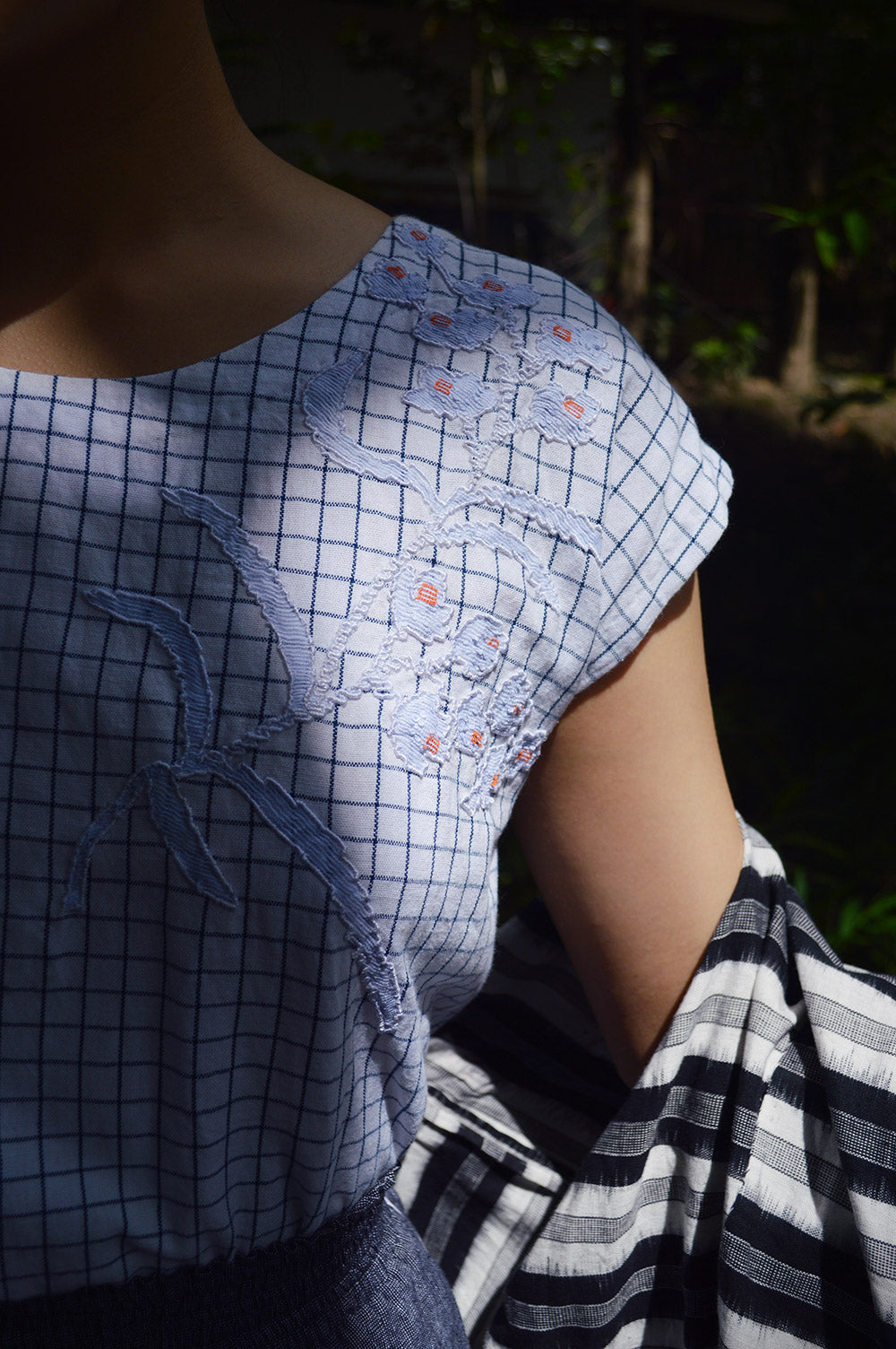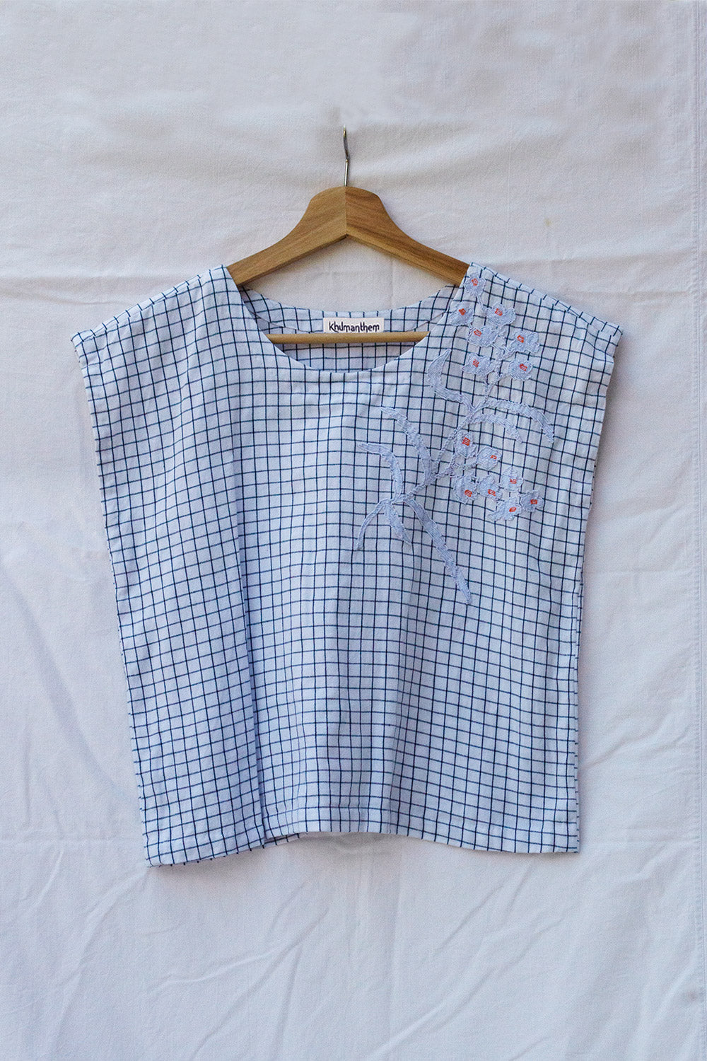 Handwoven checkered top with cap sleeves, embroidered with up-cycled floral appliqué work, using motifs from an old Wangkhei phee (thin cotton scarf with extra weft floral designs).