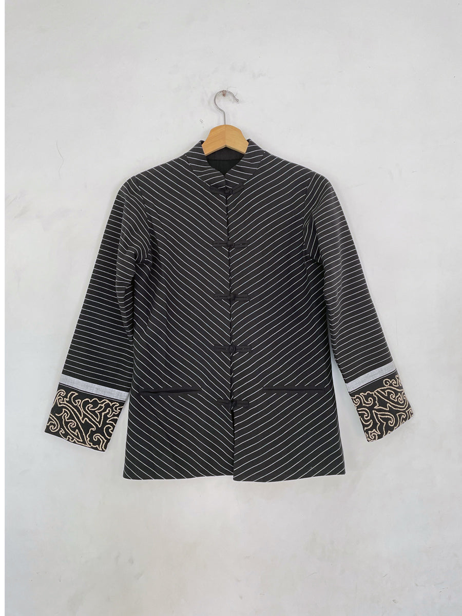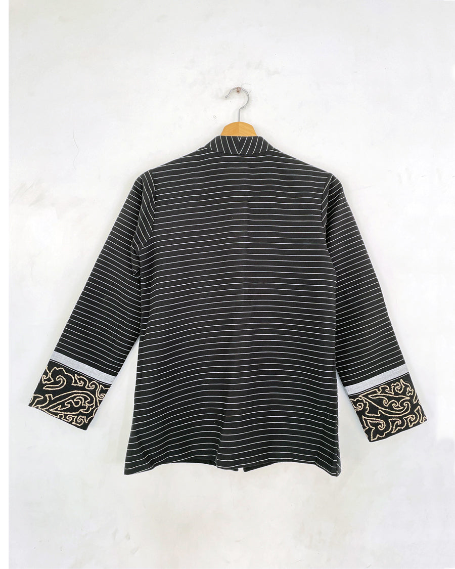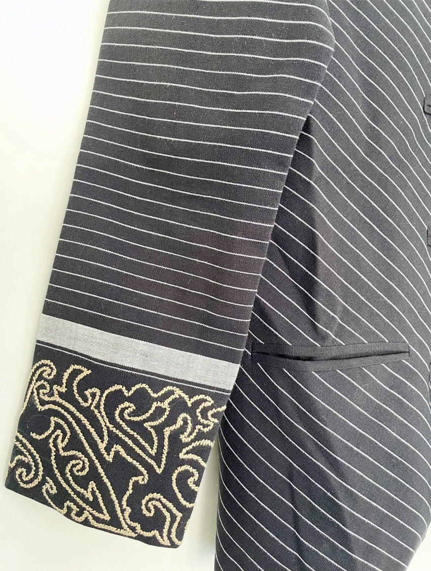 The Straight Fit Kum Coat features a mandarin collar, welt pockets, and stripes artfully manipulated to create a radiating illusion. Hand-embroidered with an abstract interpretation of the "Angom Mayek"—a revered motif belonging to the Angom clan - one of the seven ancient clans of the Meitei—this statement piece embodies a harmonious balance between the past and the present.