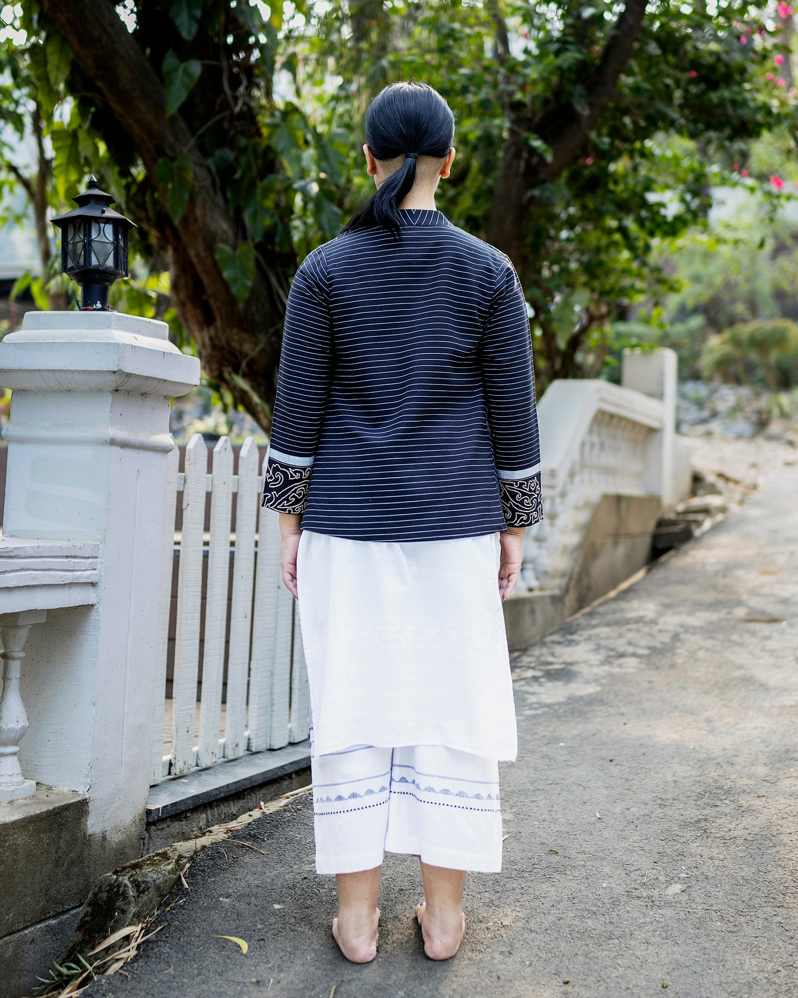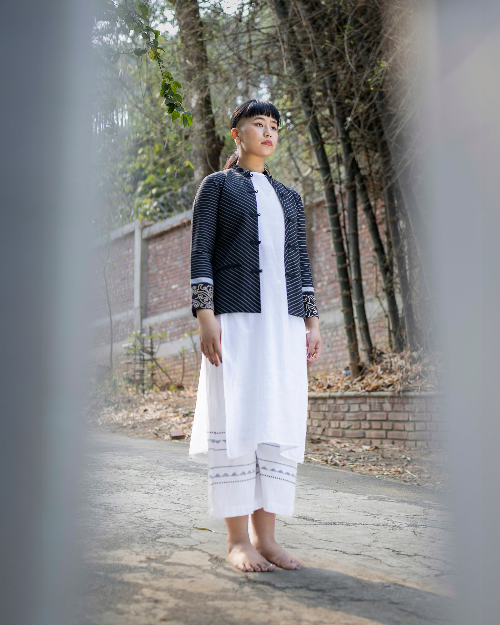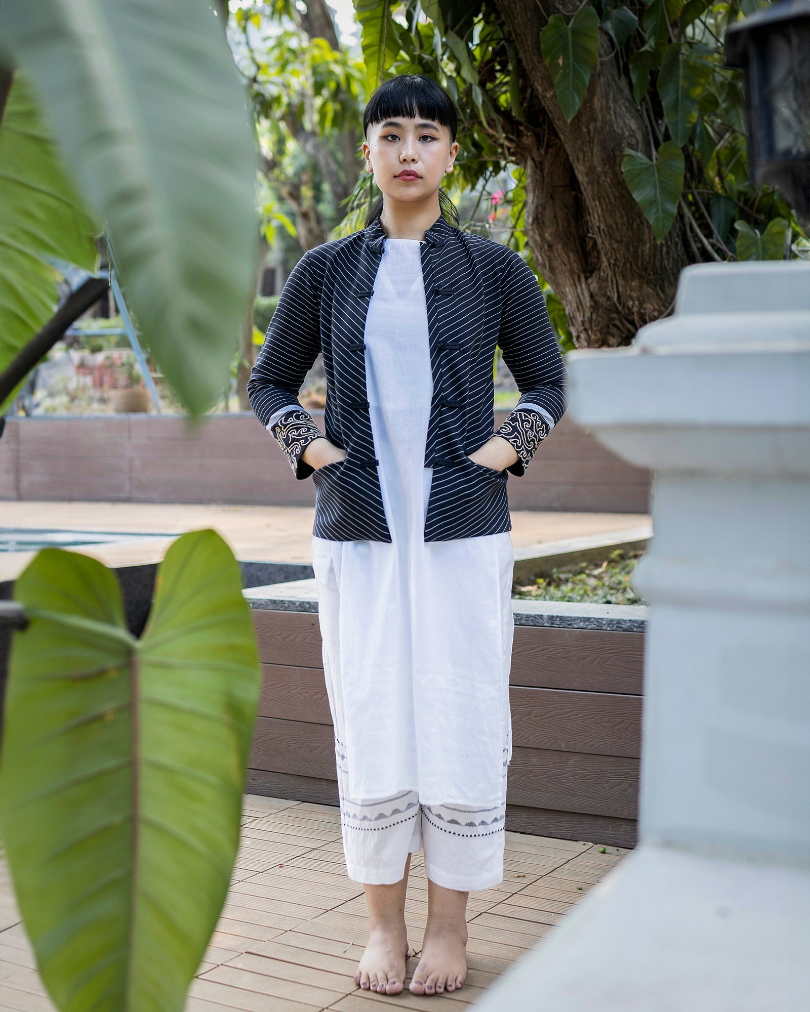 The Straight Fit Kum Coat features a mandarin collar, welt pockets, and stripes artfully manipulated to create a radiating illusion. Hand-embroidered with an abstract interpretation of the "Angom Mayek"—a revered motif belonging to the Angom clan - one of the seven ancient clans of the Meitei—this statement piece embodies a harmonious balance between the past and the present.