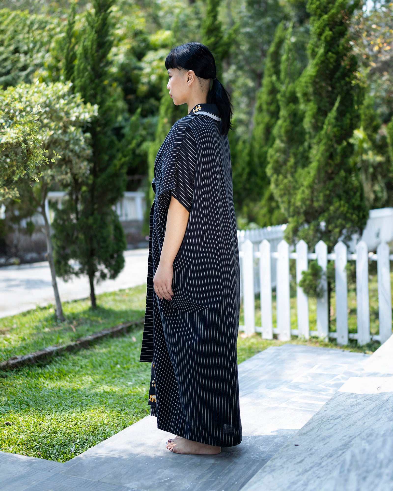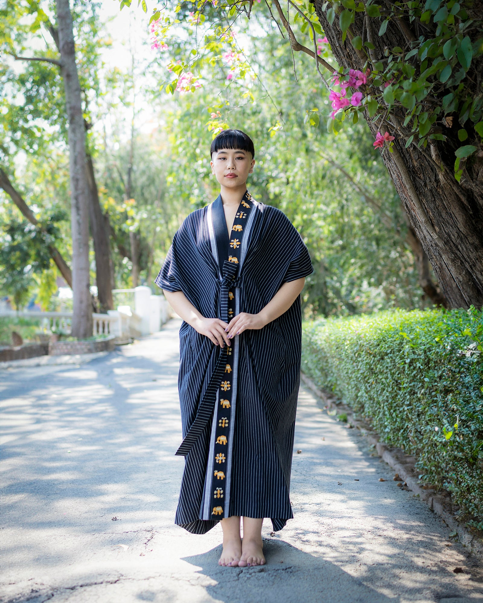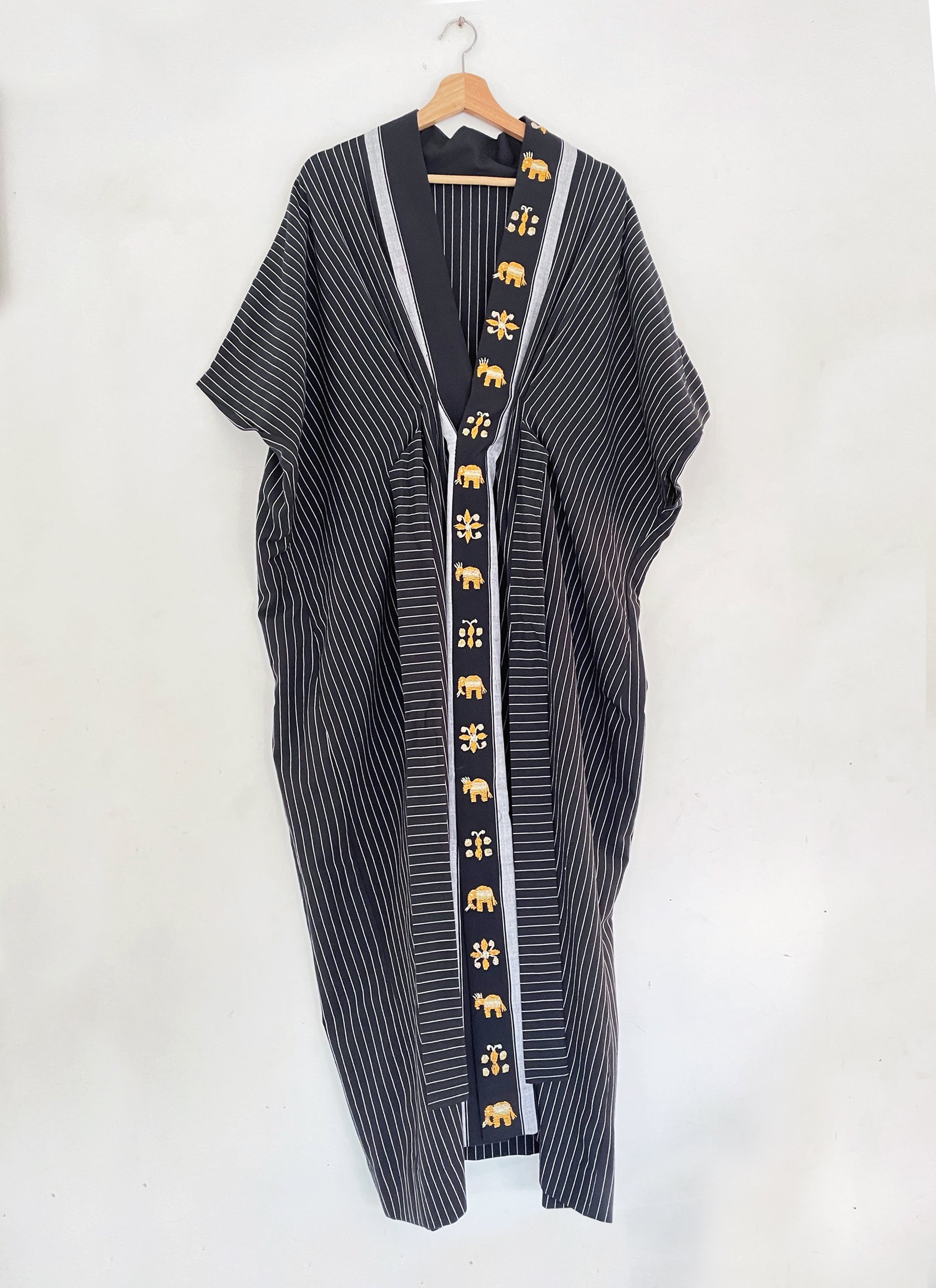 The Kum Kaftan is a versatile, unisex design enhanced with hand-embroidered Shammi Lanmi motifs. The motifs include abstract patterns of elephants, horses, peacocks, thrones, flowers, and celestial bodies, with each element carrying profound symbolic significance.