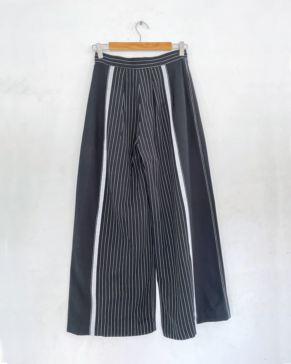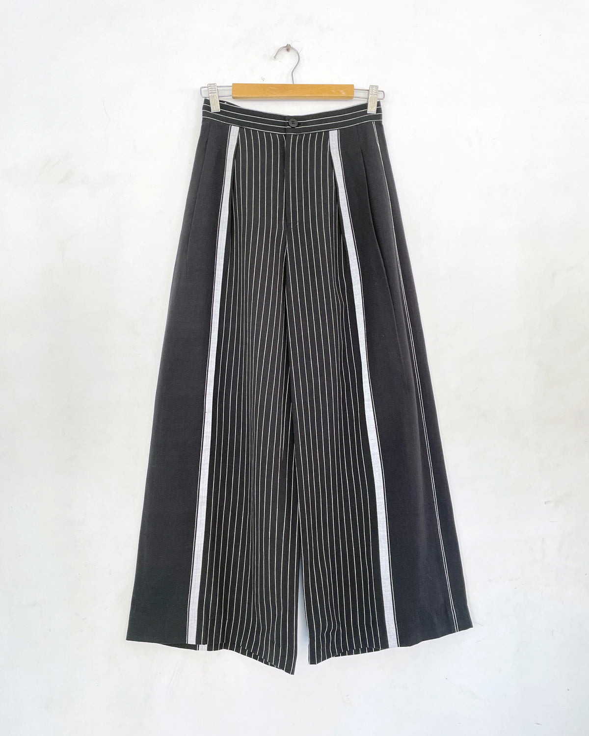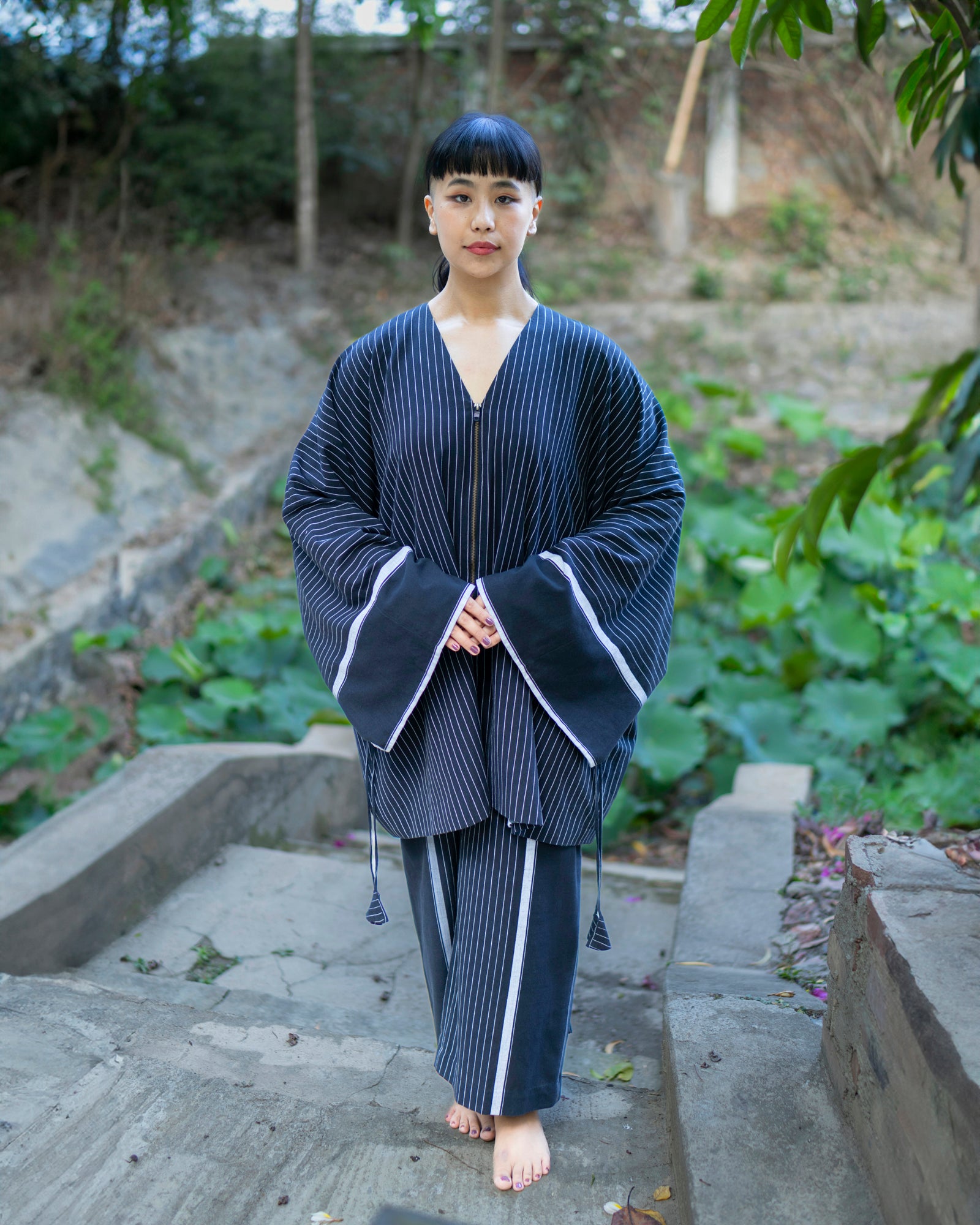 The Kyoto Pants, inspired by traditional Japanese Hakama, feature flared legs for comfort and a sustainable design that utilizes both the border and body of handwoven Kumjingbi fabric.