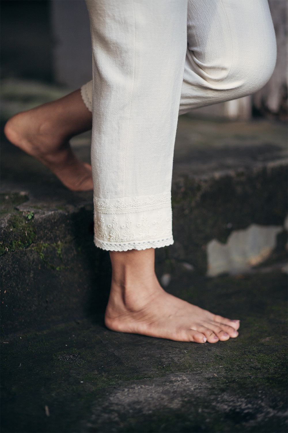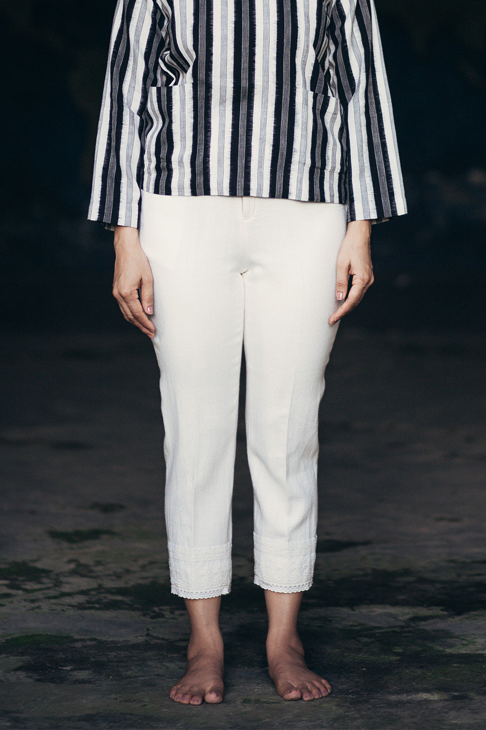 Handwoven cotton capri with diamond pattern weave. Lace inserts at the pant hem gives the capri a classy touch