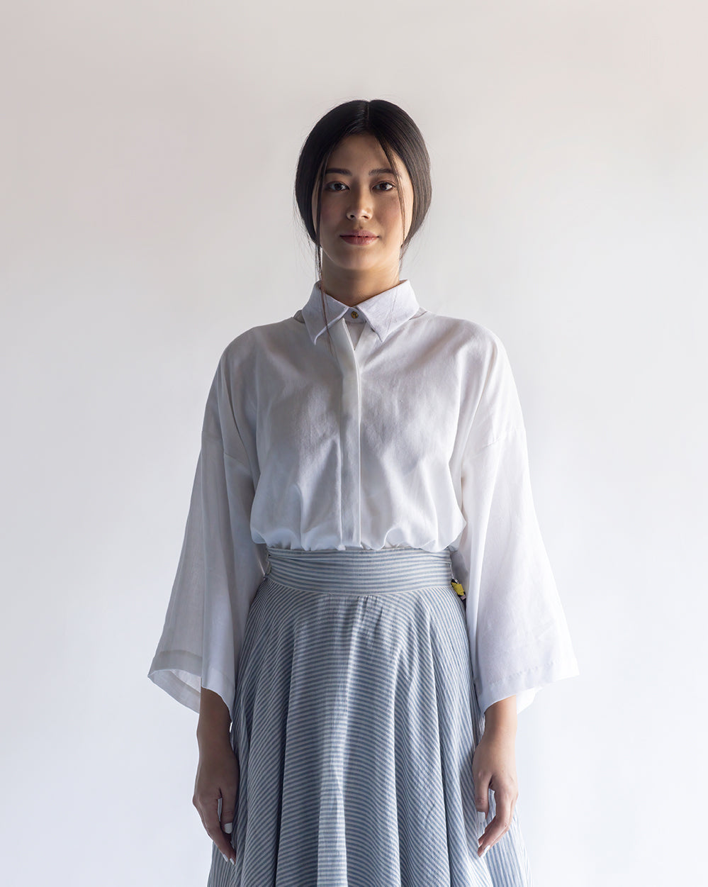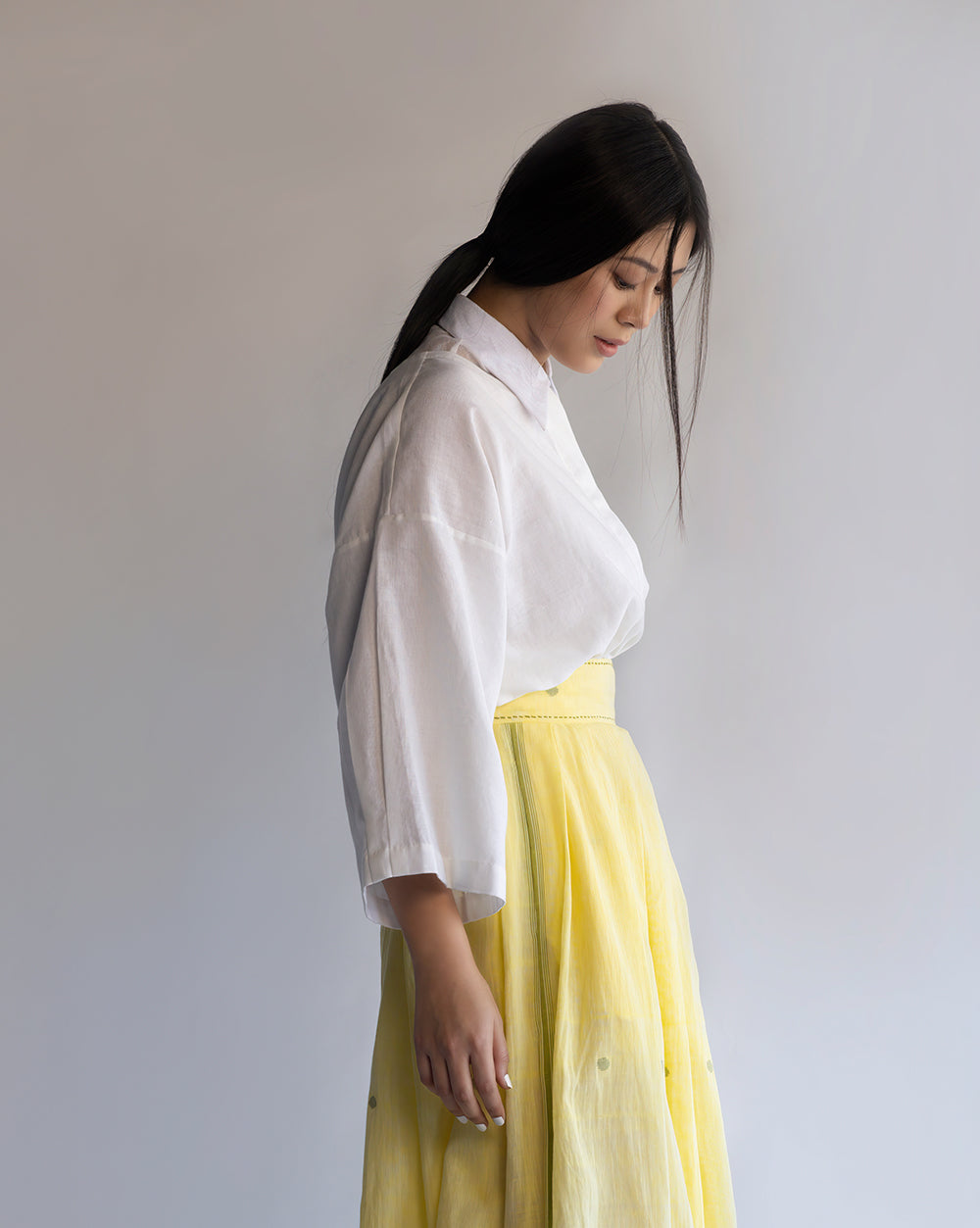 The Nikko Shirt comes in a timeless white tone. This drop shoulder, full-sleeves shirt is crafted in handloom cotton fabric.