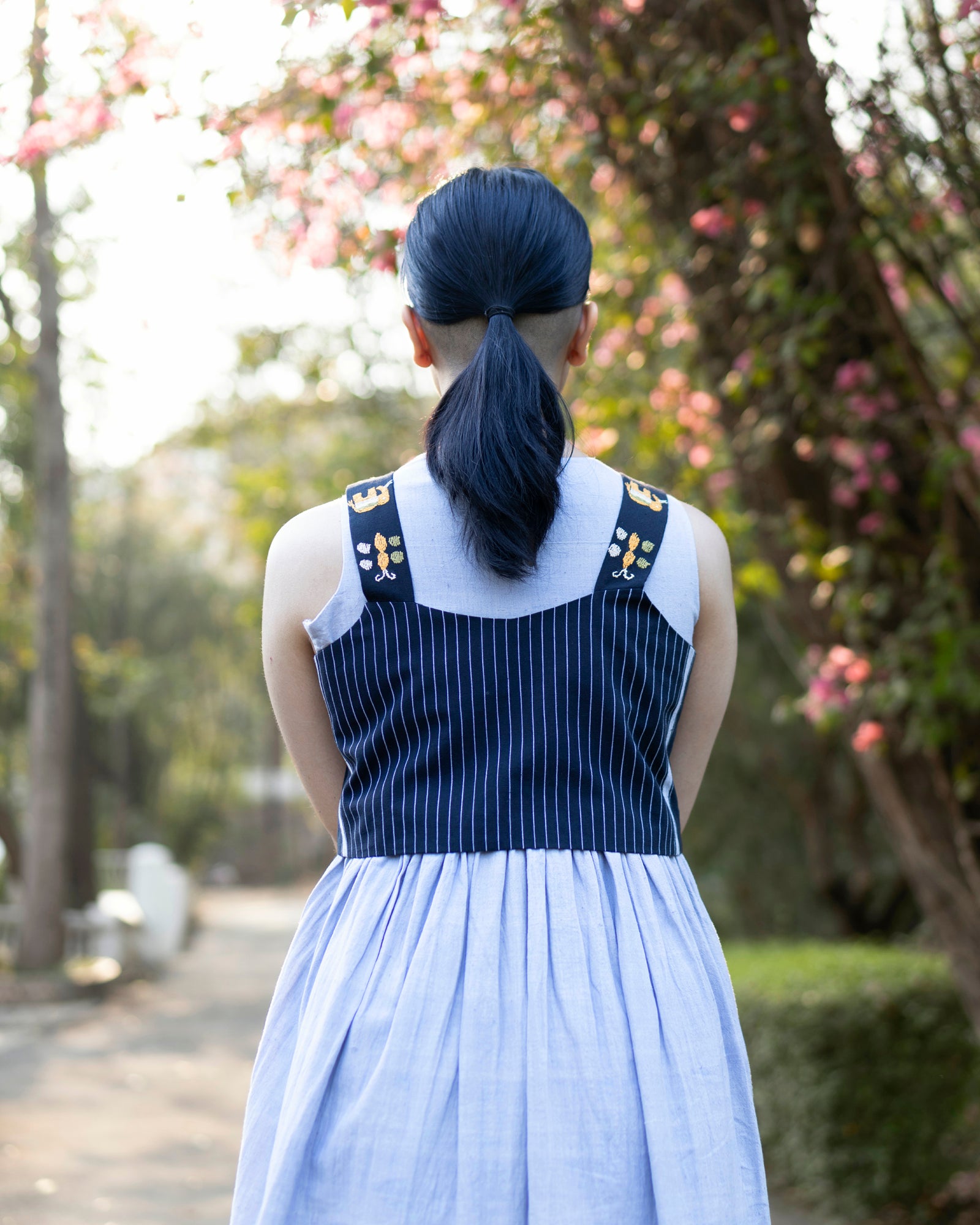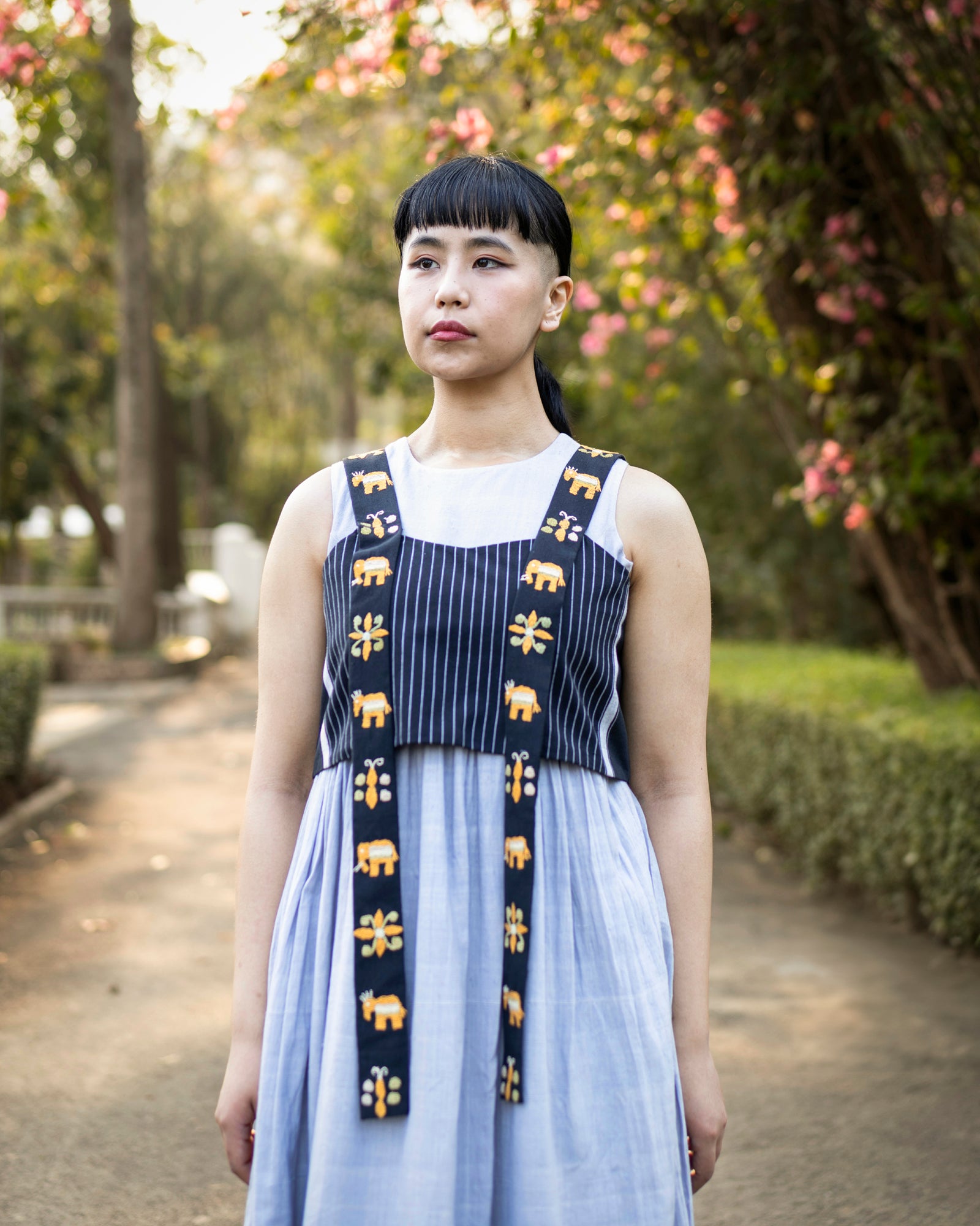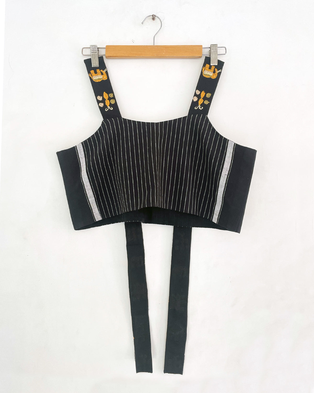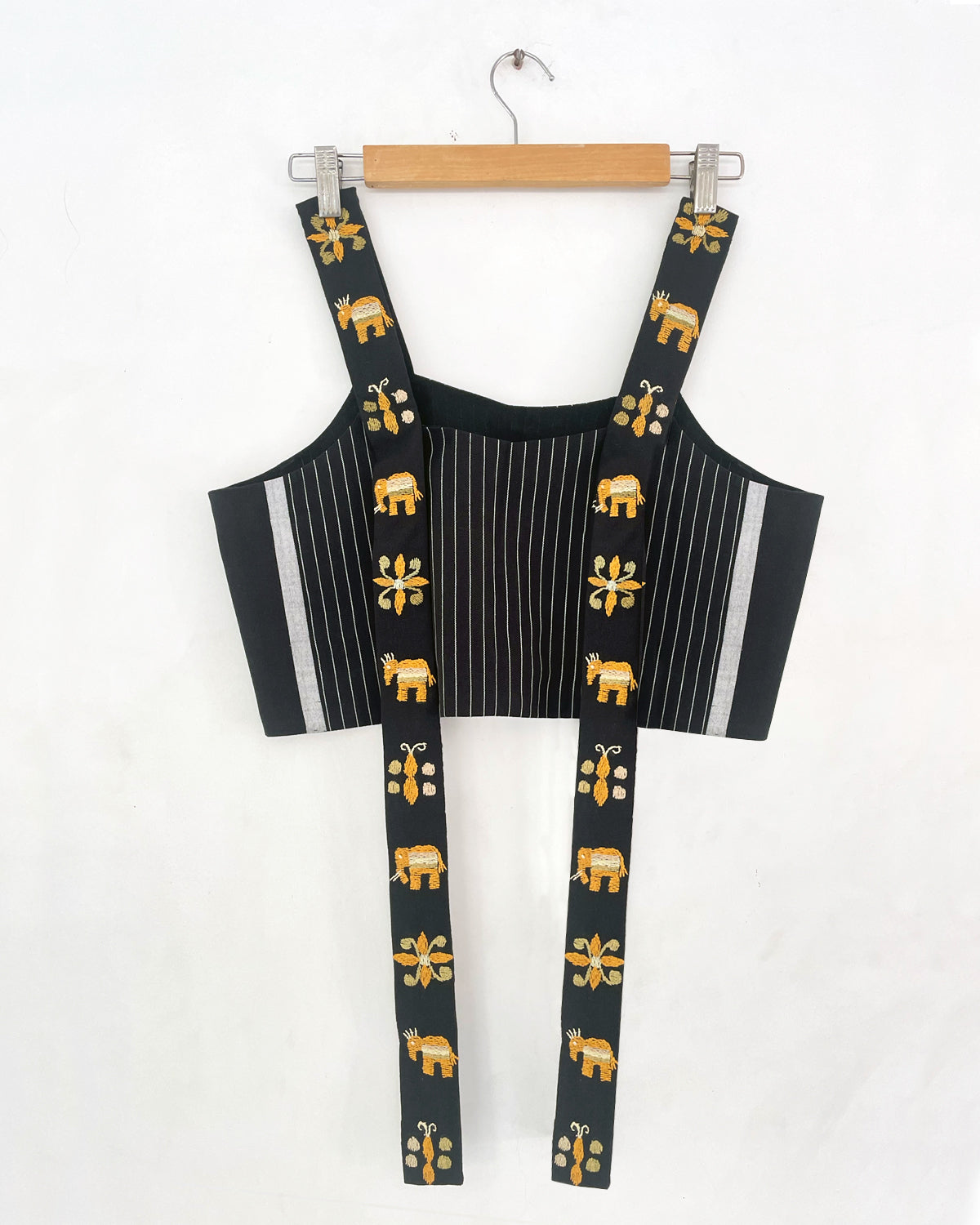 The Obi Top is a cropped design crafted from handwoven cotton Kumjingbi, featuring long, hand-embroidered sashes adorned with the bold Shami Lanmi motif.