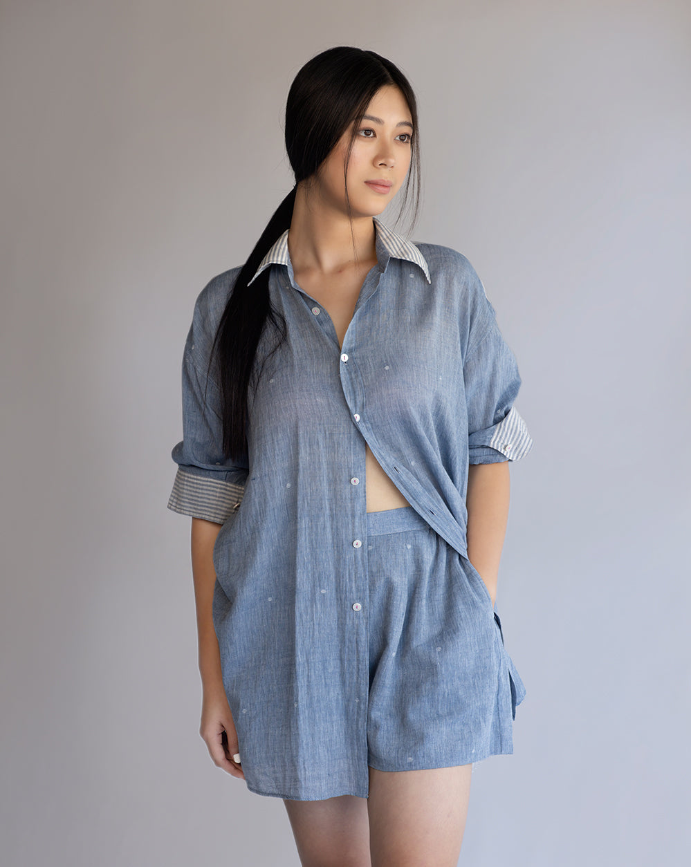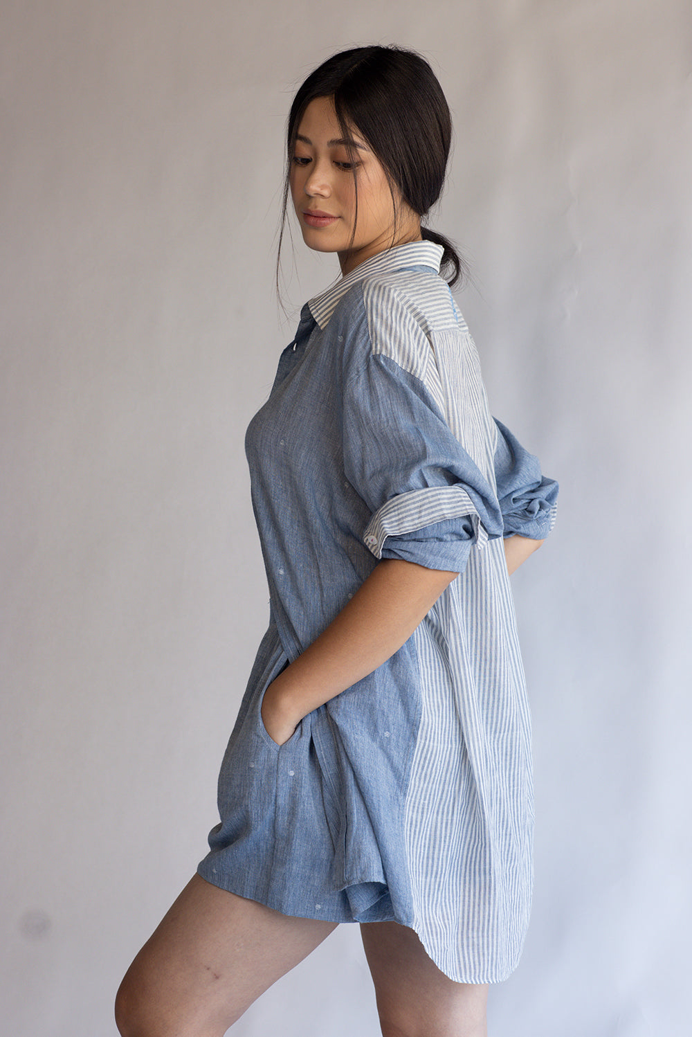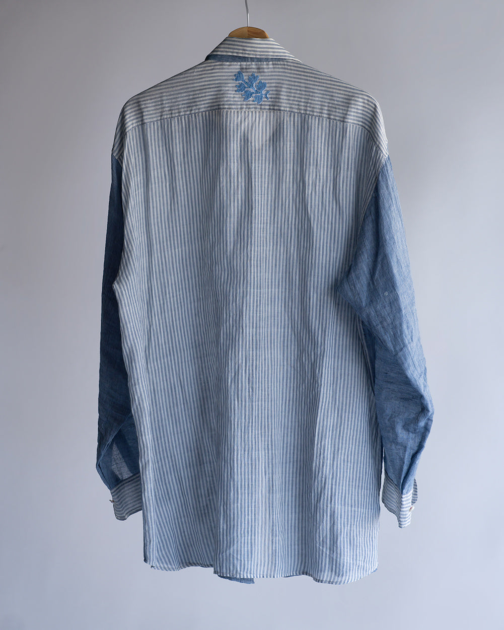 Dual tone handwoven cotton boyfriend shirt with upcycled appliqué work at the back yoke.