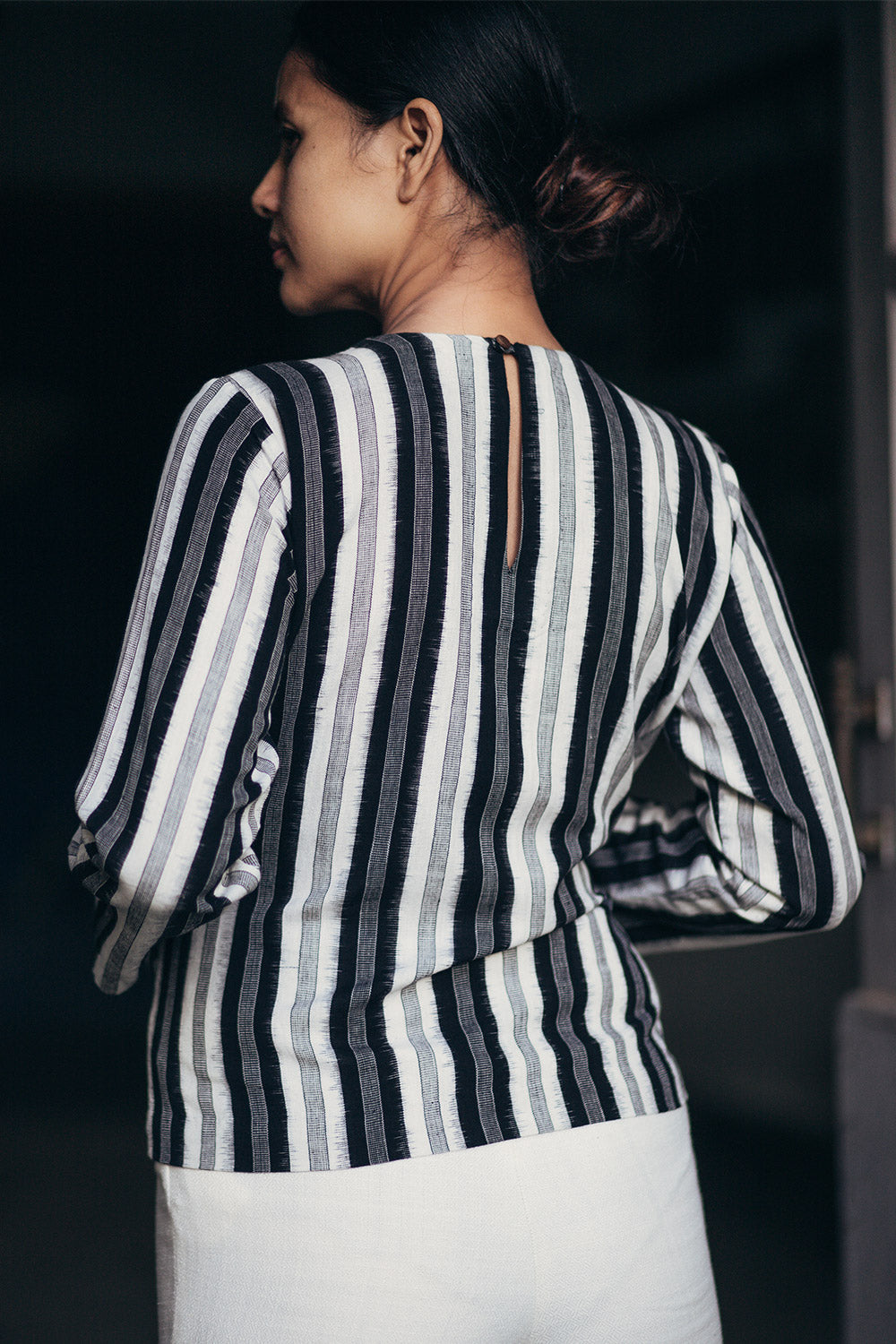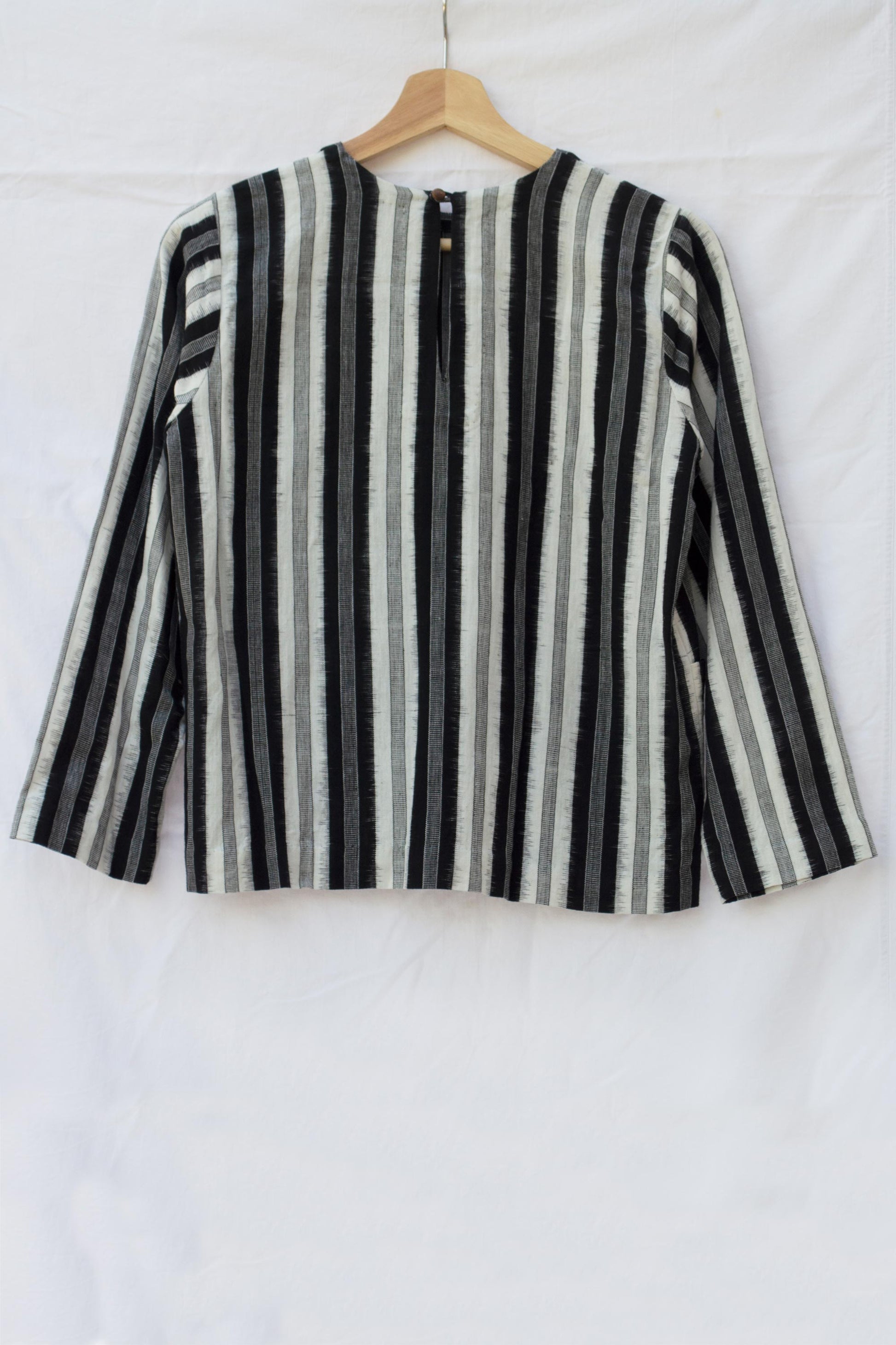Ikat striped top with a clean, structured silhouette. Cut for ease with front patch pockets and finished with a subtle keyhole opening at the back. The woven stripes lend a graphic clarity, offering a modern take on a traditional weave.