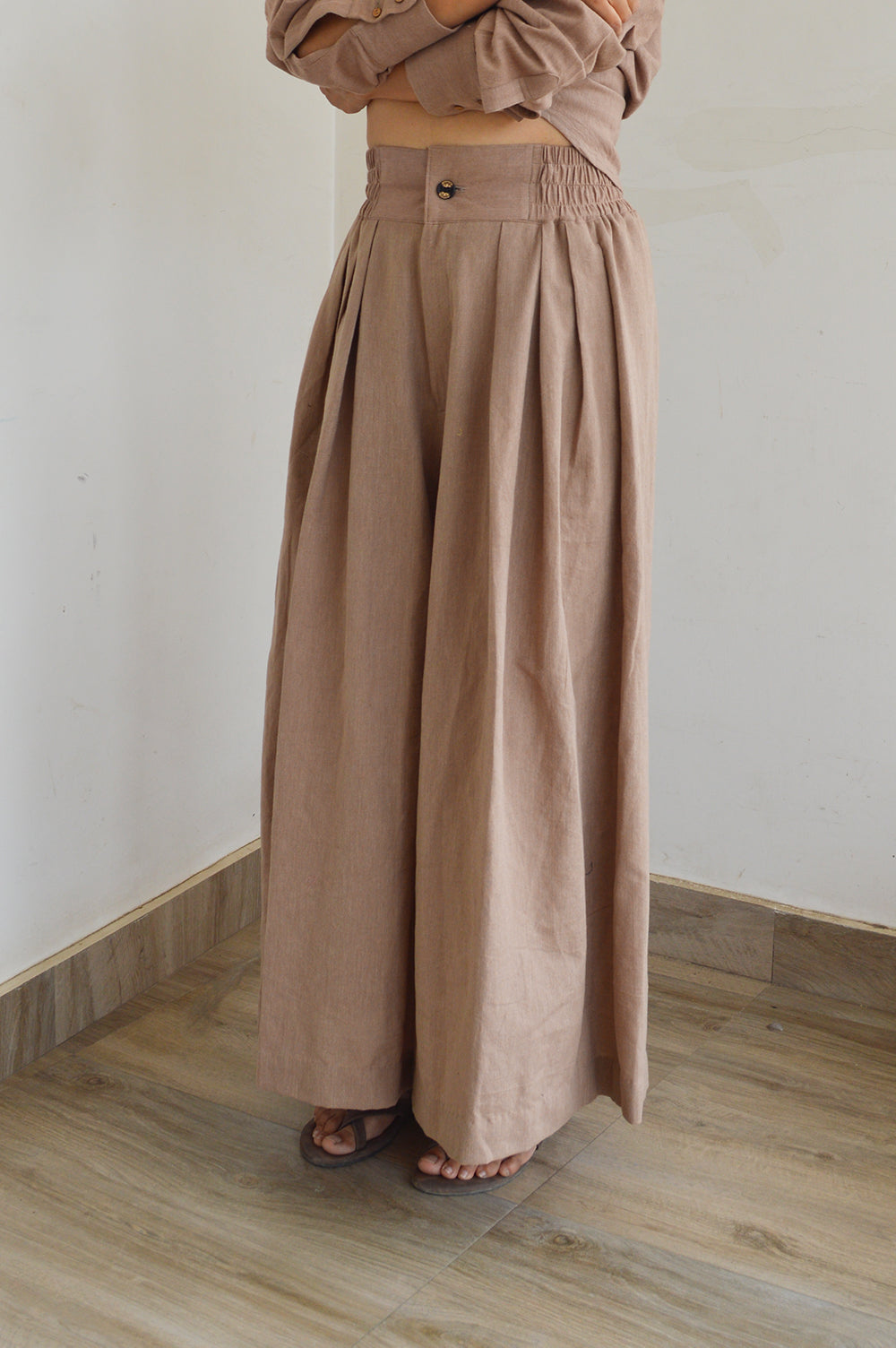 The Sand trousers are made of 100% cotton fabric which is handwoven by our artisans. The trousers showcase pleats for an exaggerated wide leg fit and elasticated waist
