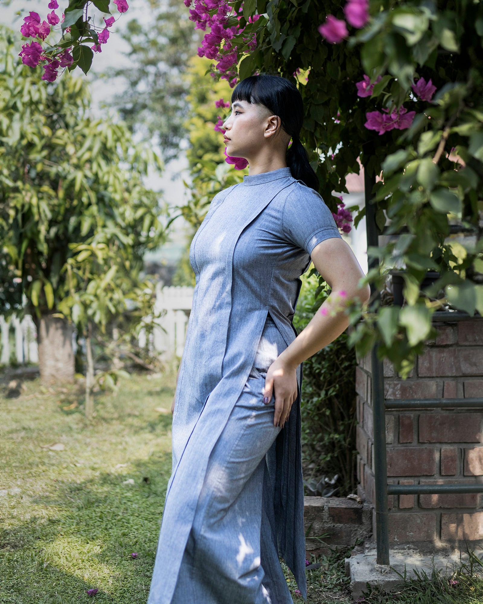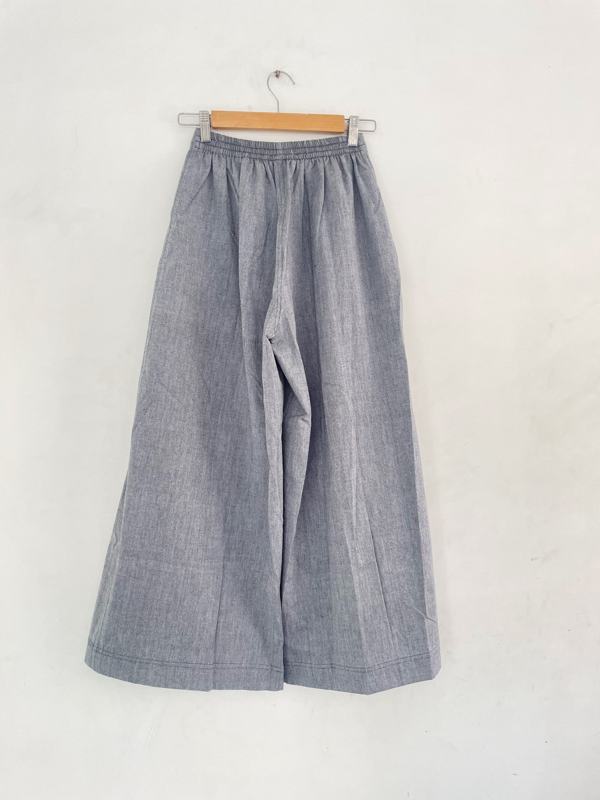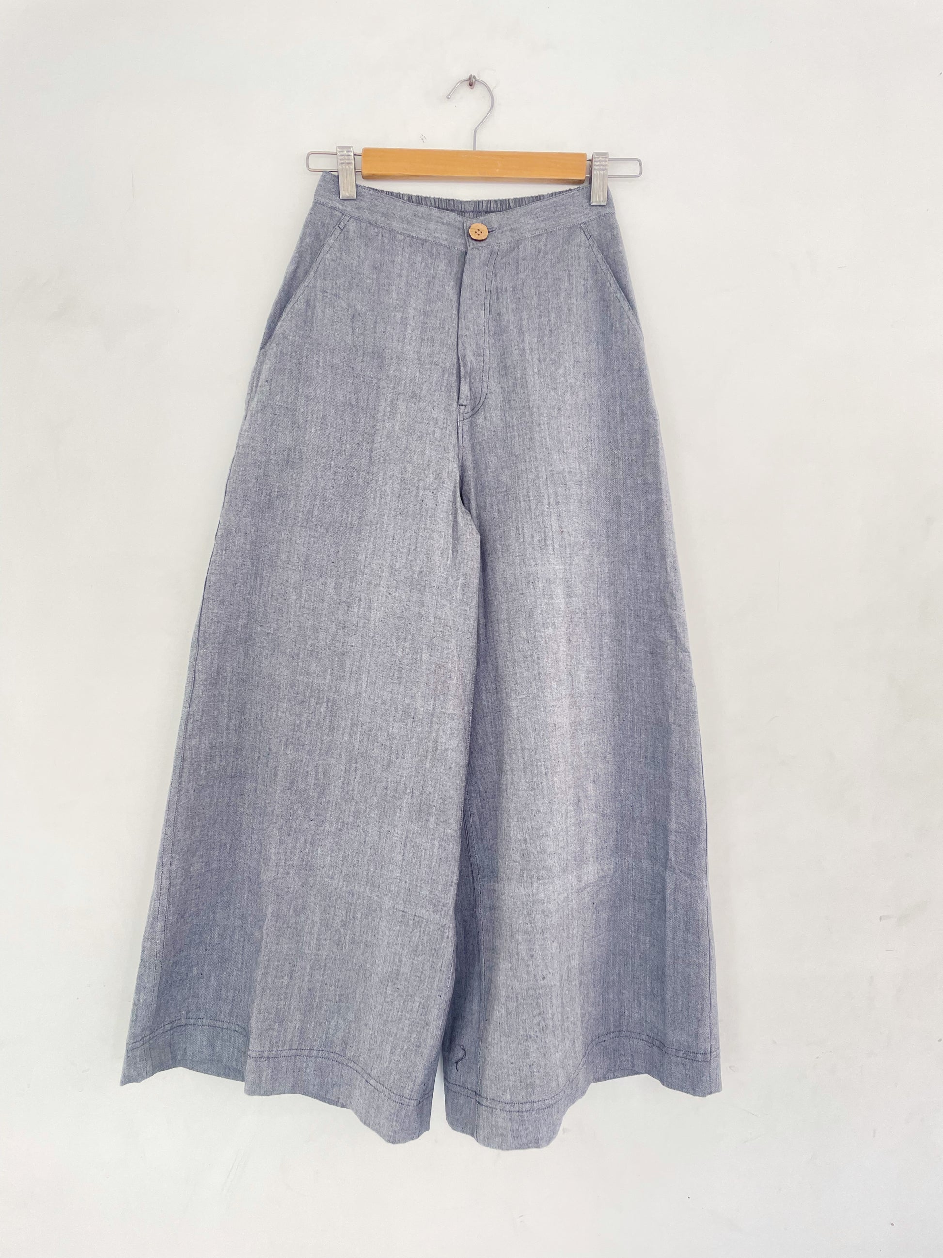 The Smoke Palazzo, crafted from handwoven cotton is a roomy pant with wooden button in the front and elasticated waist belt for an adjustable fit.