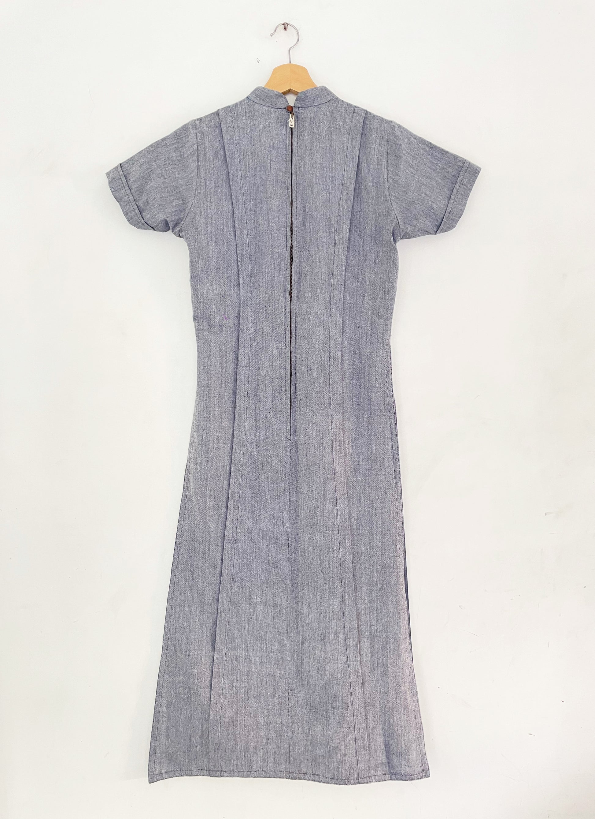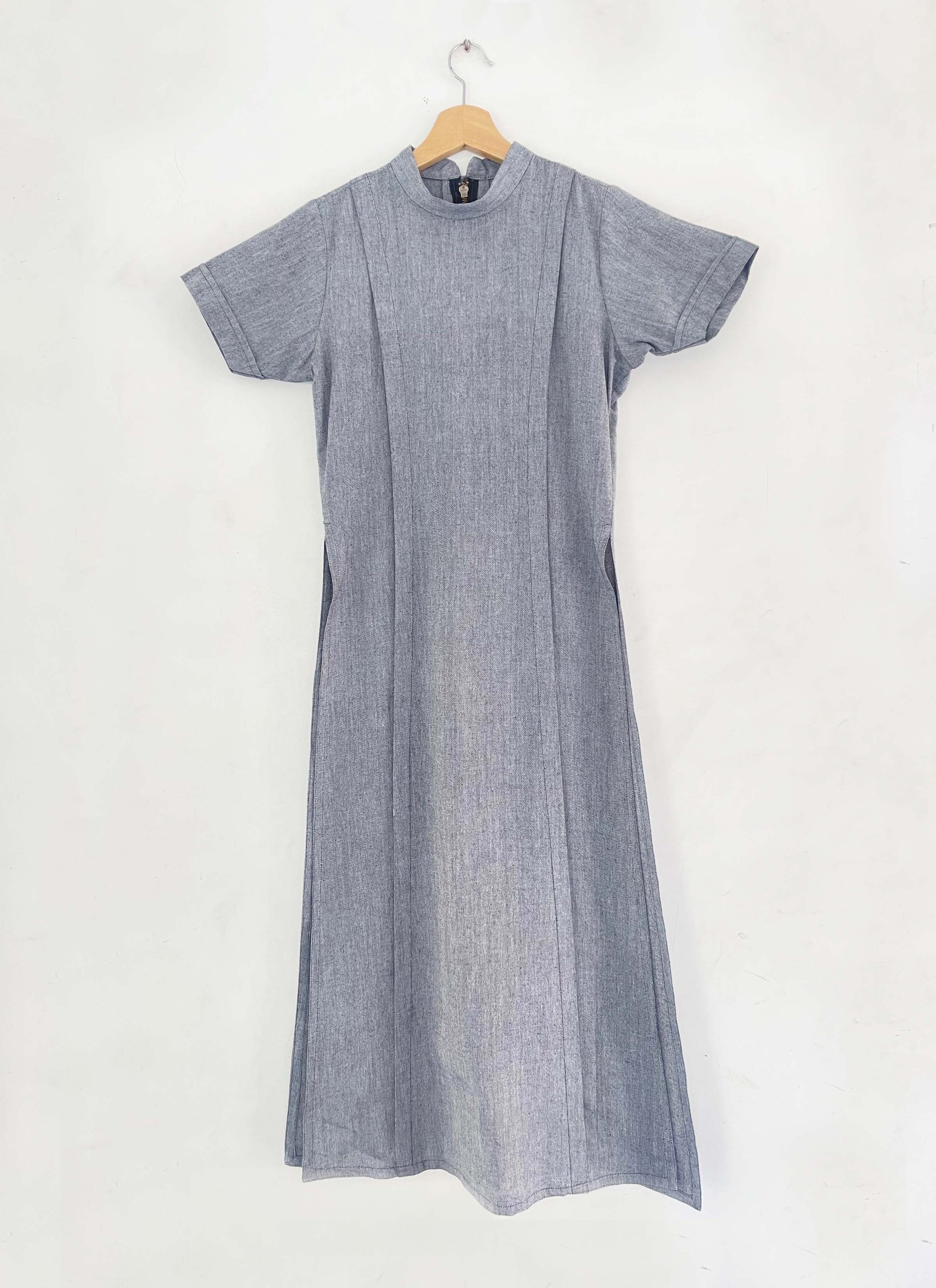 The Smoke Tunic, crafted from handwoven cotton, features two parallel pleats running vertically down its full length, a mandarin collar, short sleeves, and long side slits. The back opening, secured with a metallic zipper, introduces a modern, industrial touch, adding a layer of contrast to the garment's simple, yet thoughtful design.