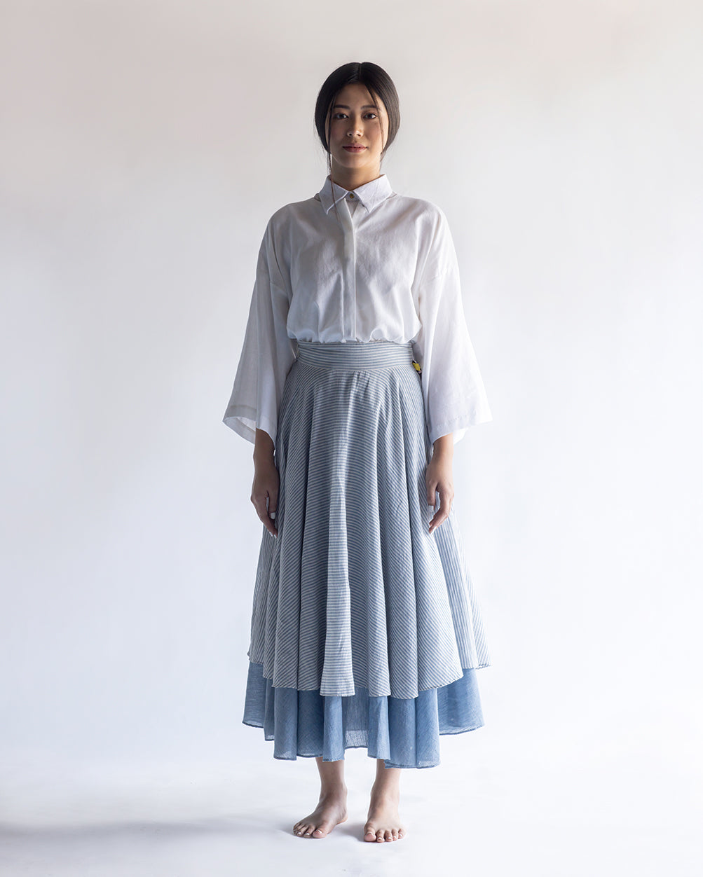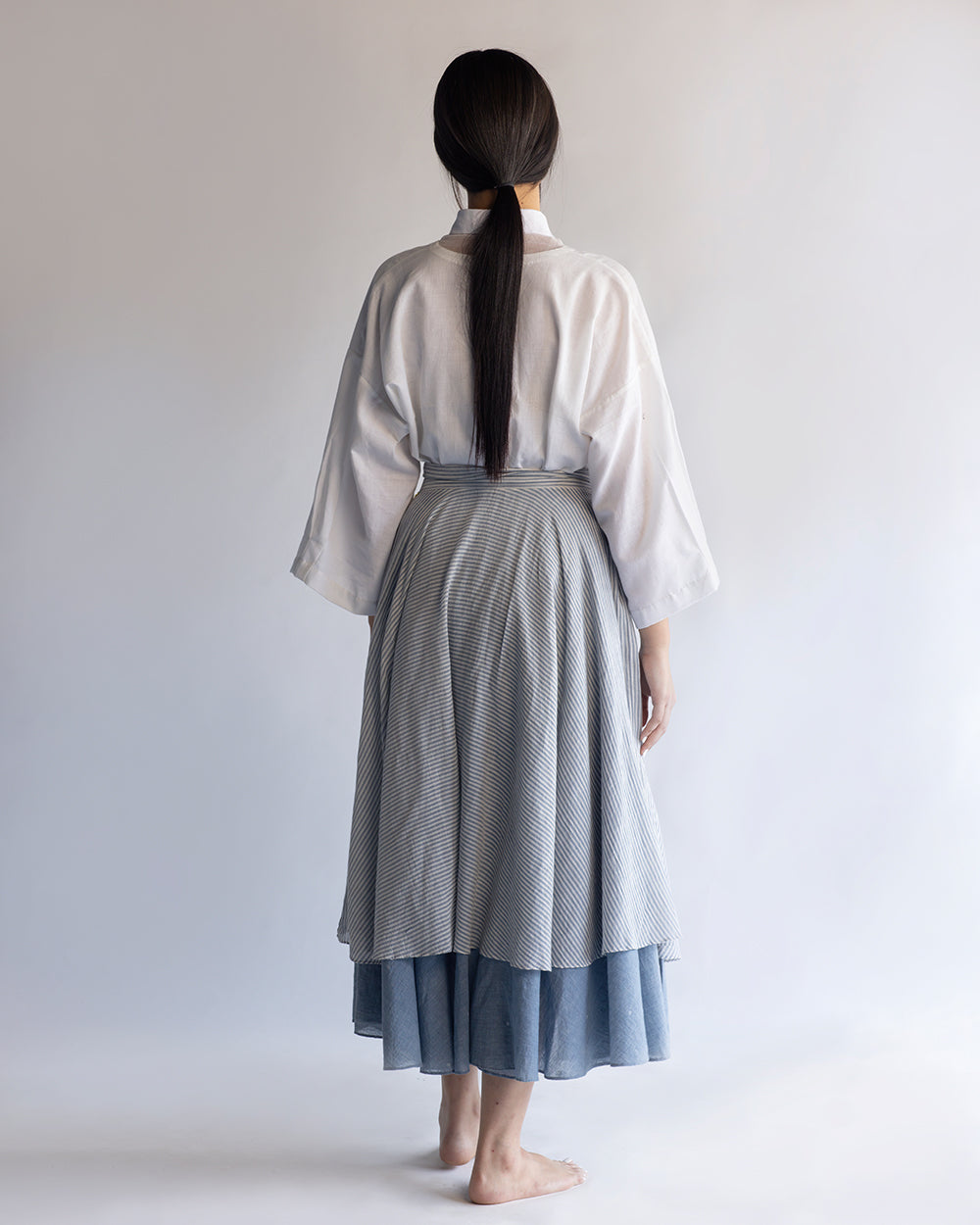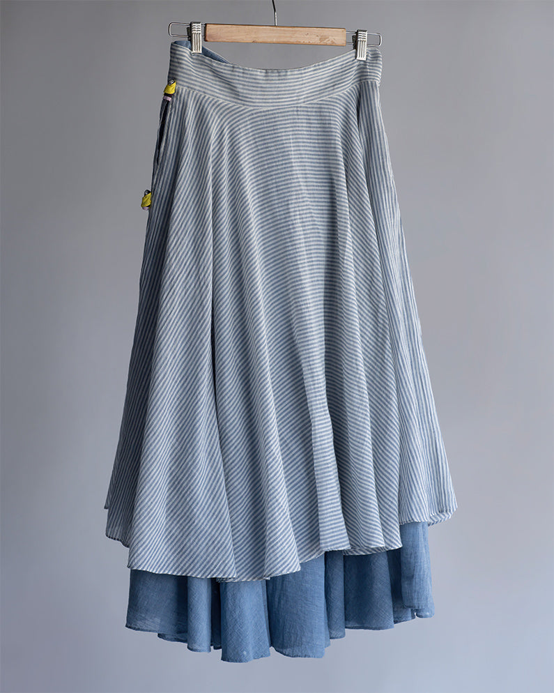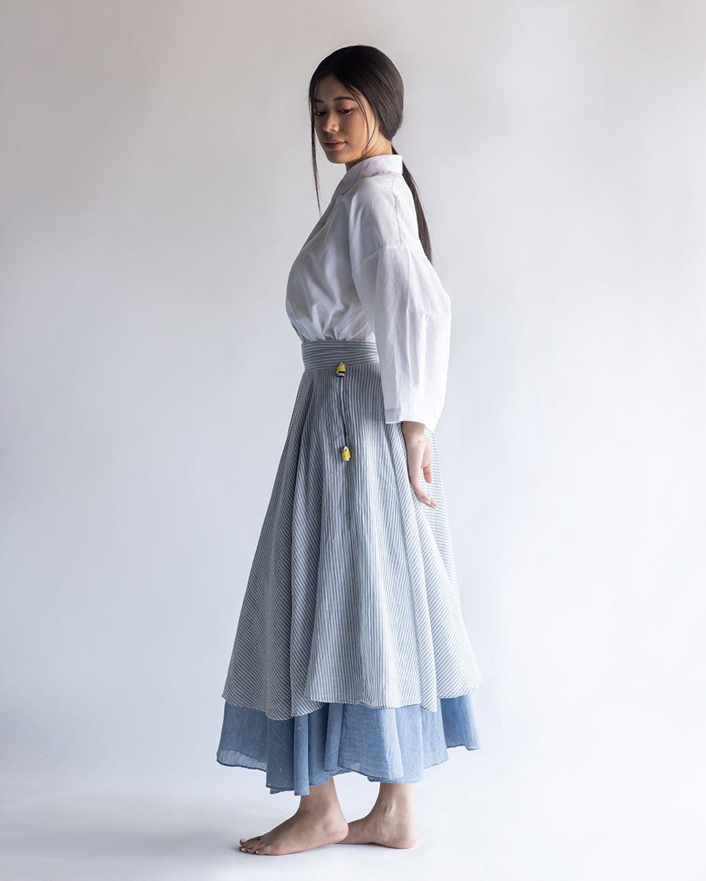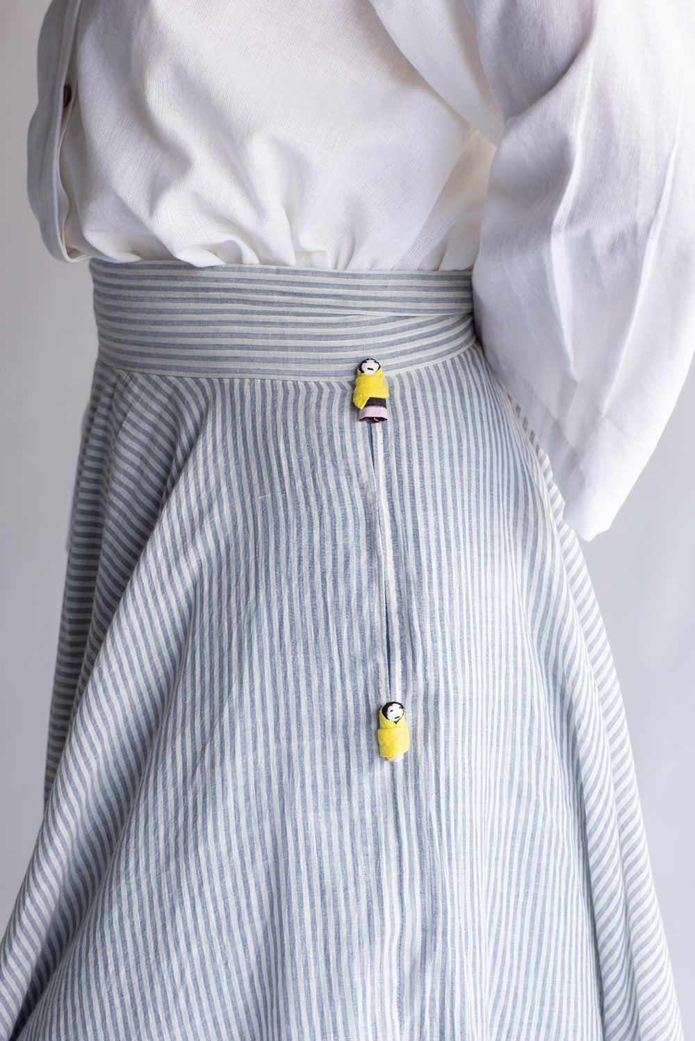 The Moon Stone Skirt is made using handwoven cotton fabric. The top skirt features a soft striped weave with slits to reach into the inner pocket and decorated with dolls. The inside skirt in powder blue base has a scattering of hand-crafted dots (butti/kabok chaiba) and deep pockets on the sides.