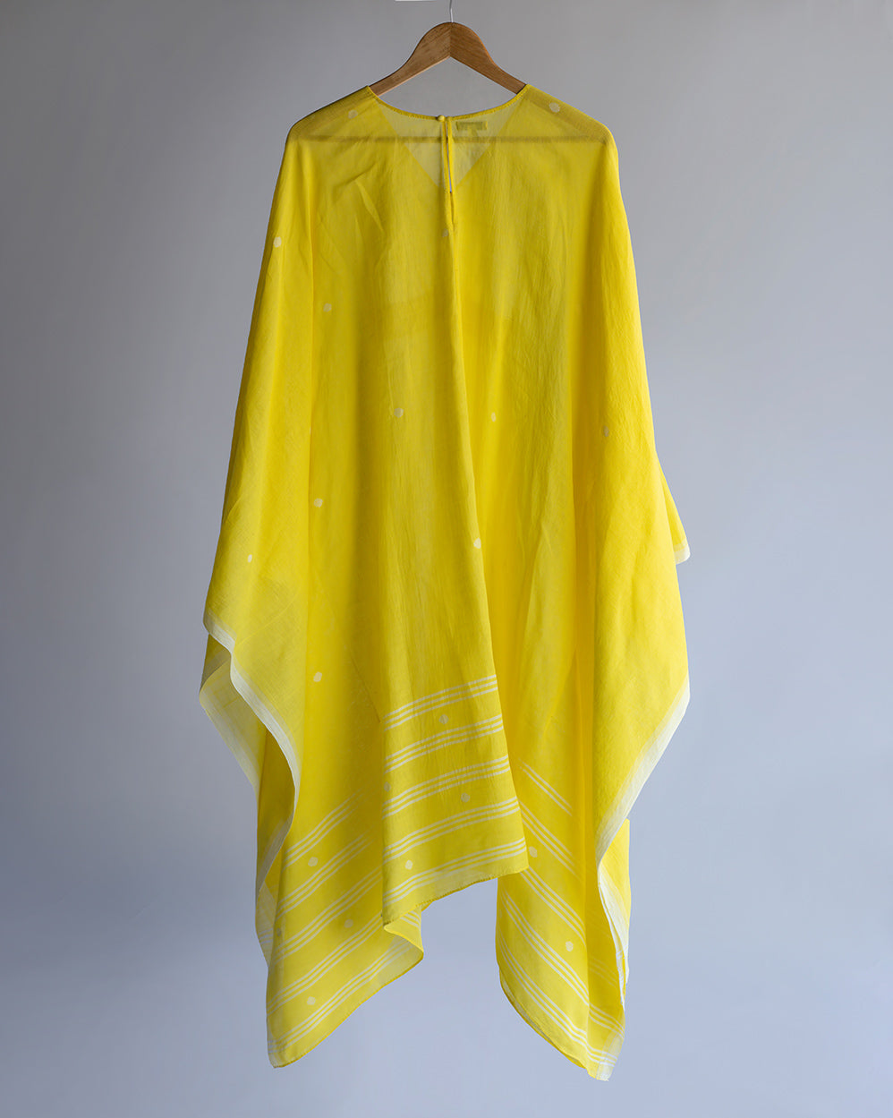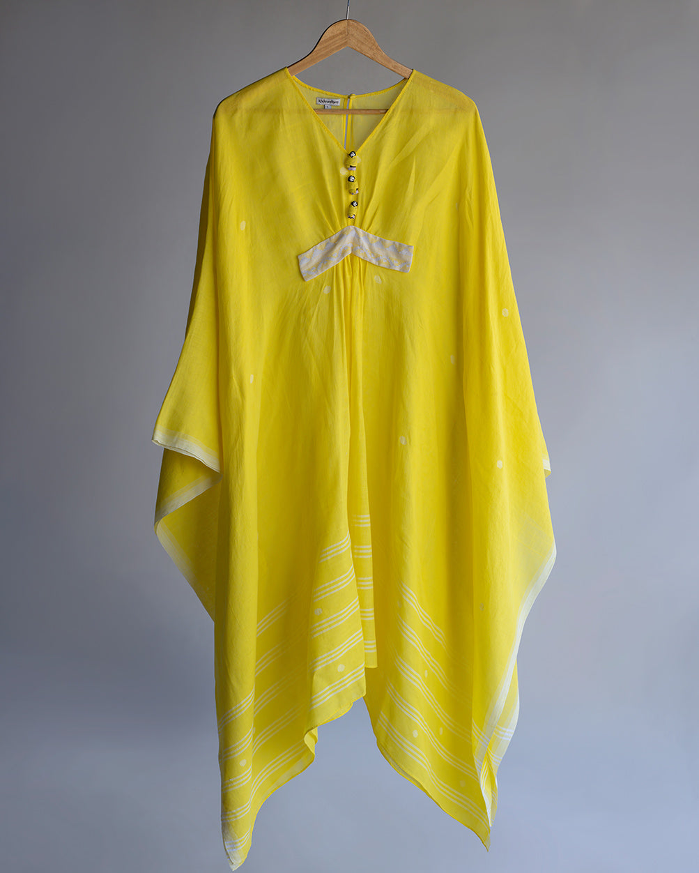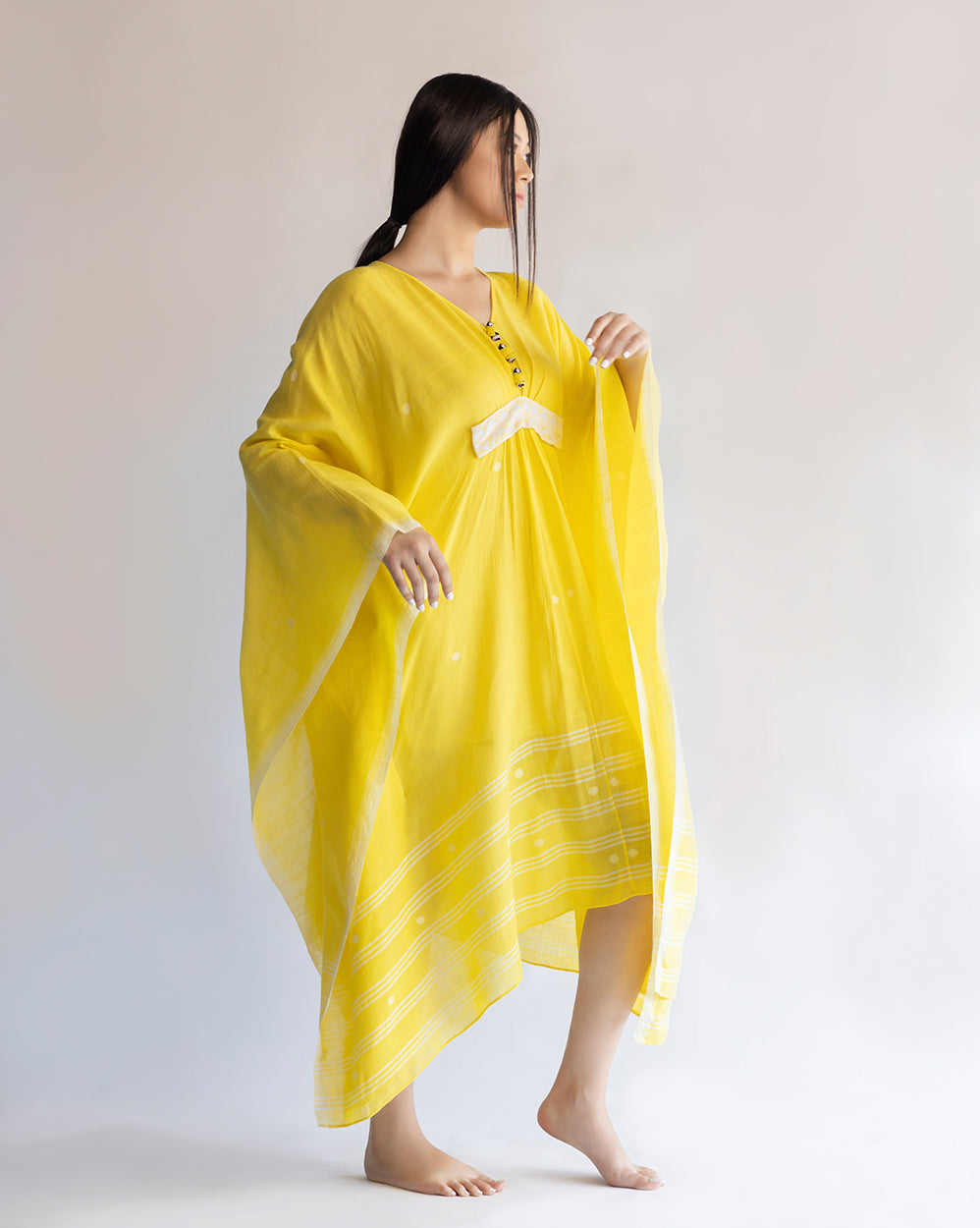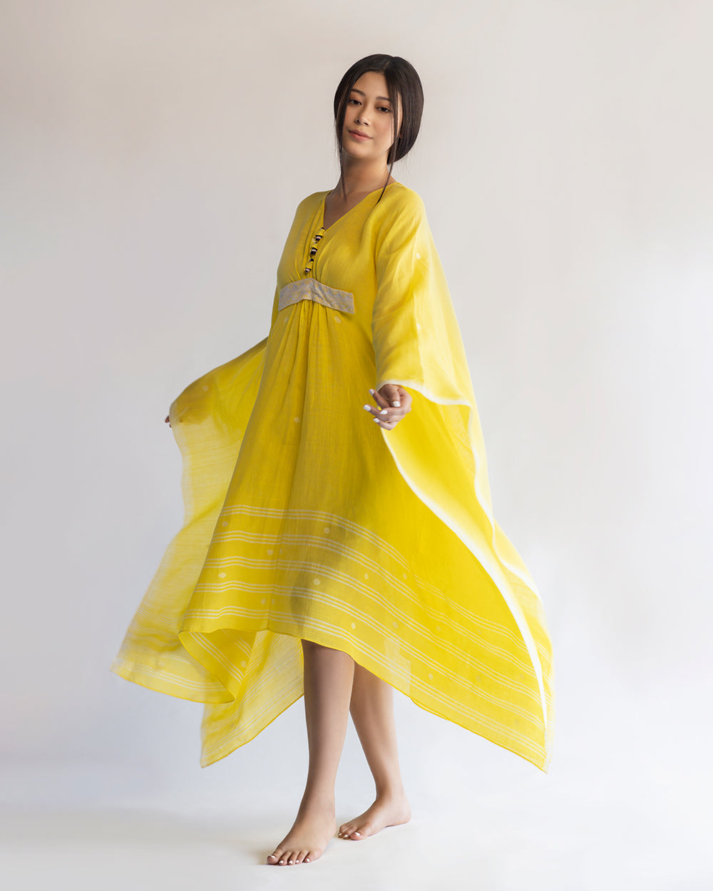 Flowy yellow kaftan in handwoven cotton embellished with handmade Manipuri dolls and belt with extra weft design.