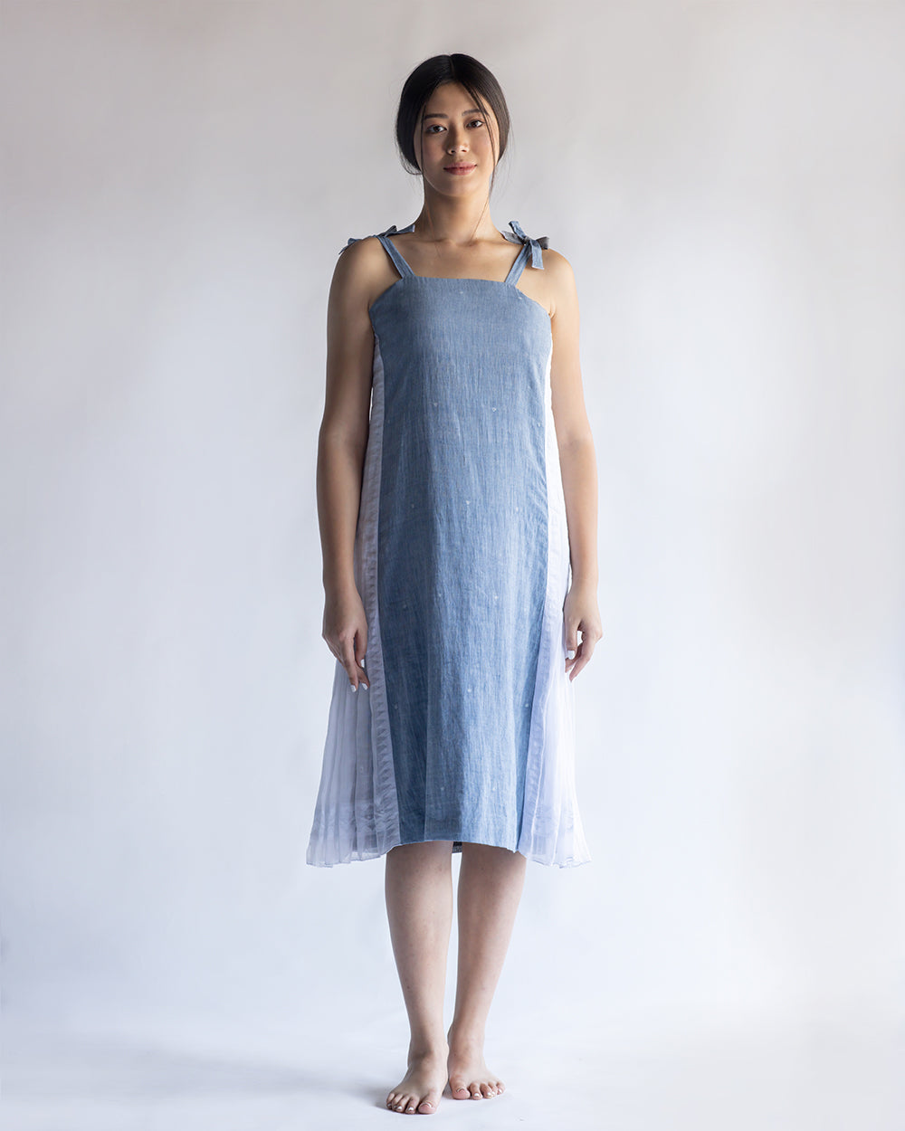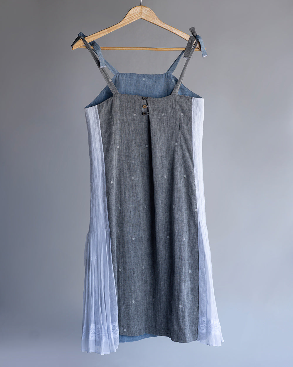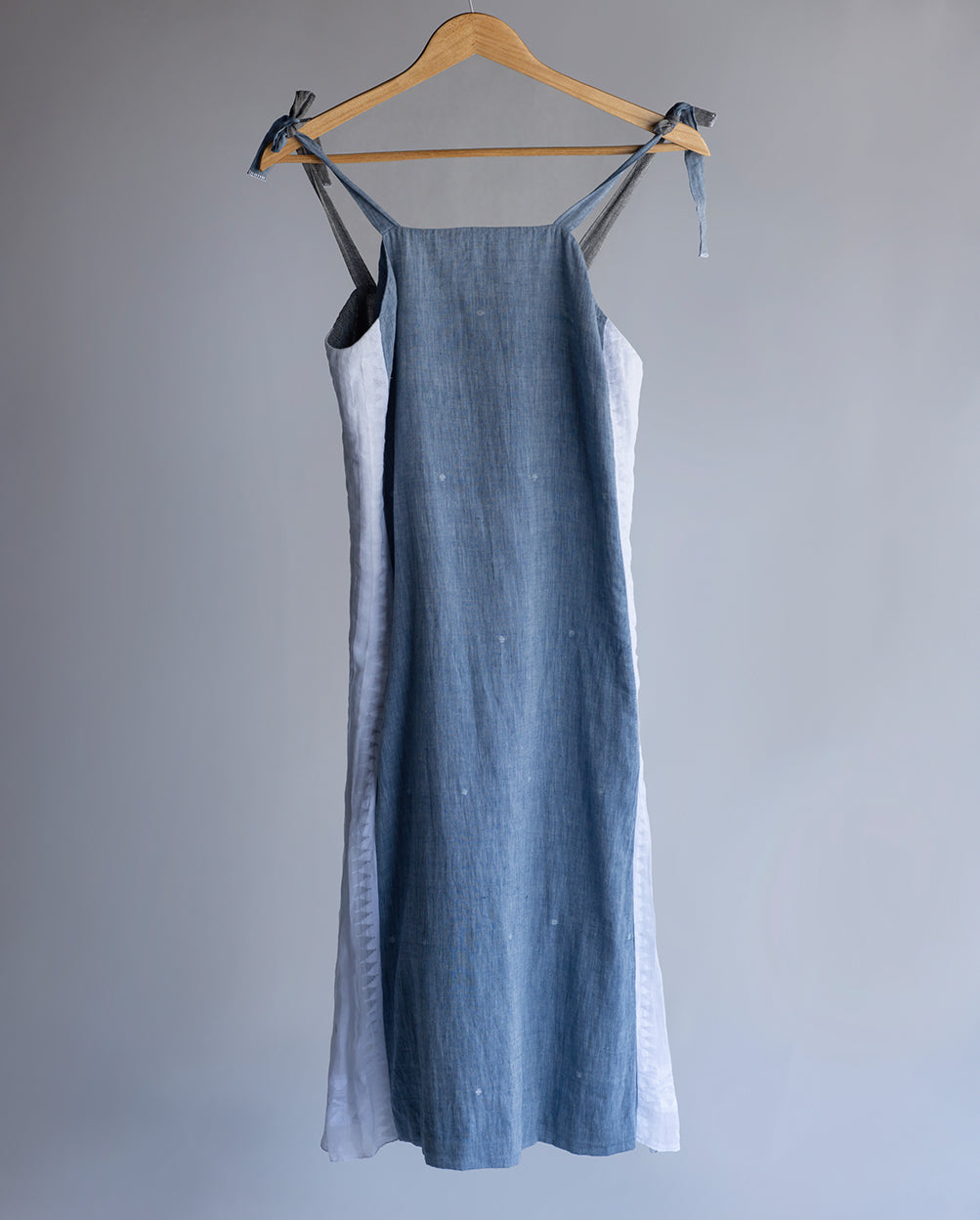 Handwoven cotton dress with shoulder tie-ups and Wangkhei phee (Jamdani fabric) panel on the sides.
