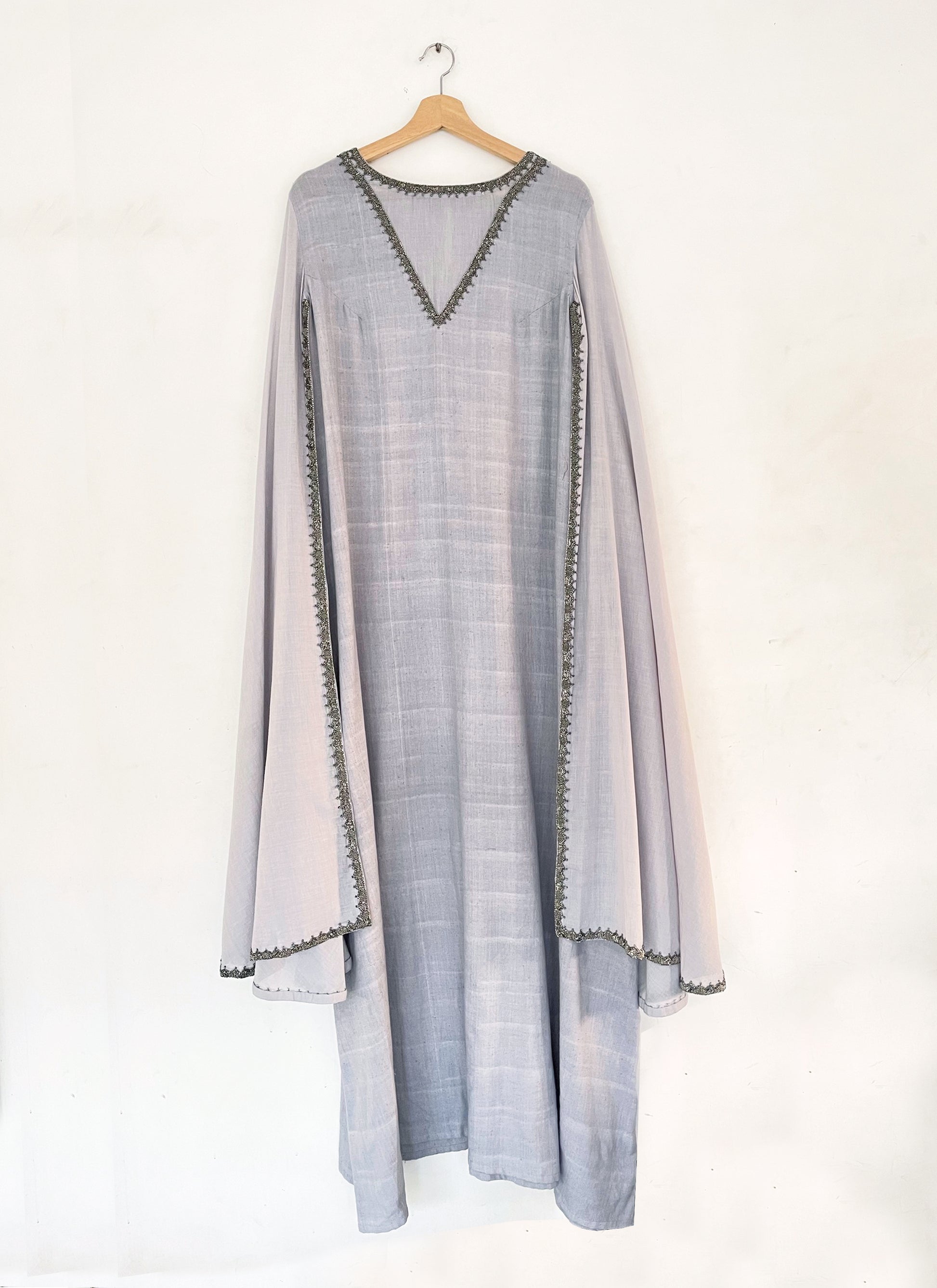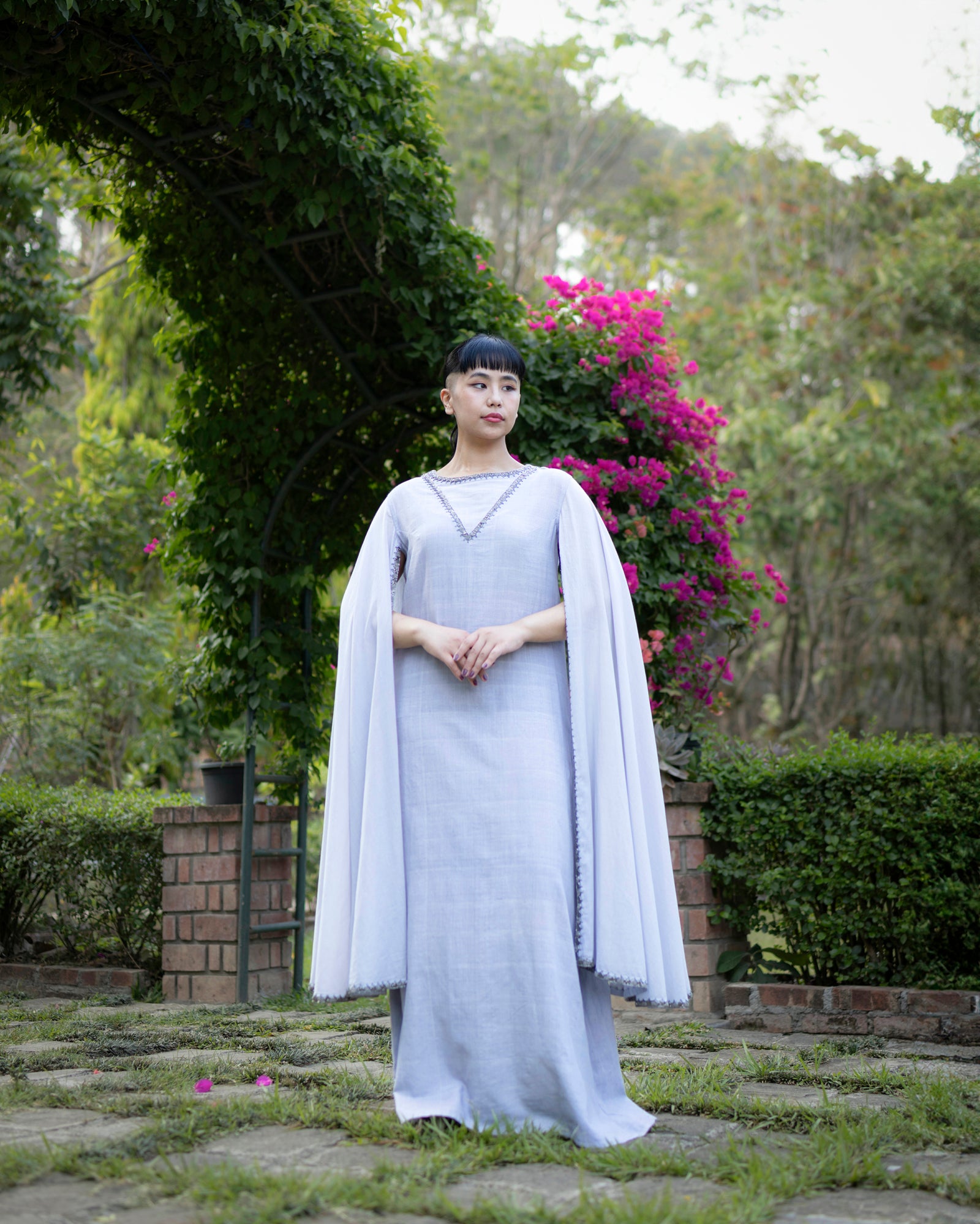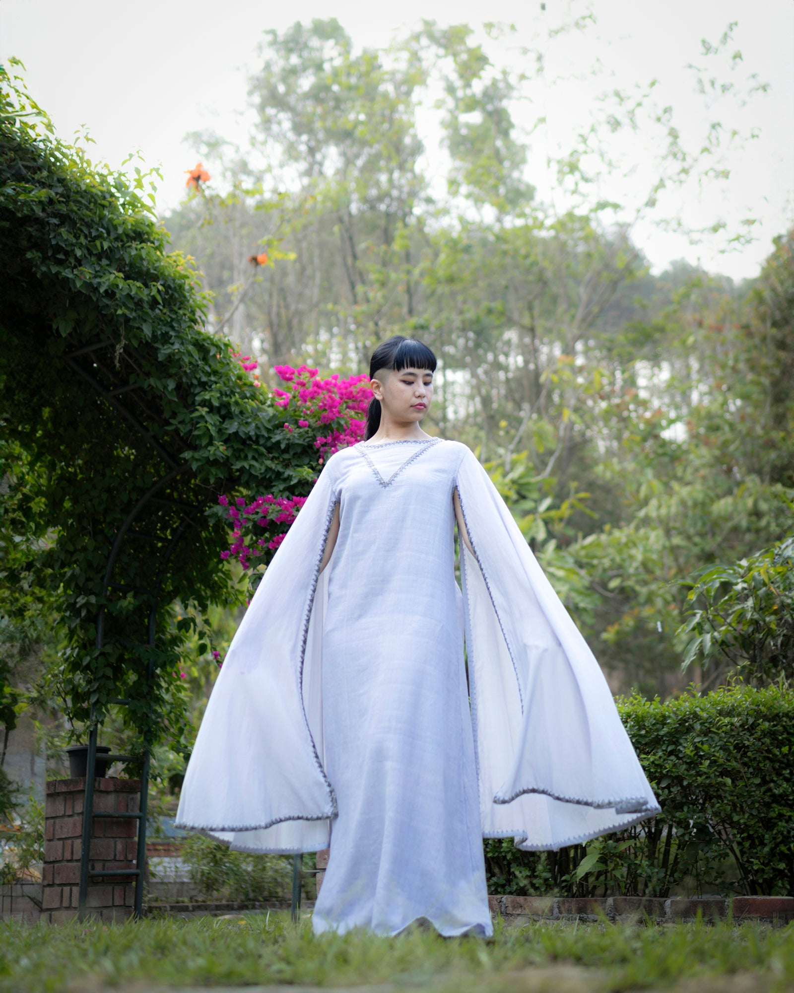Valour is a flowing maxi dress, crafted from Khadi. The fine muslin cape sleeves drapes like soft butter, while delicate glass beadwork, shaped in the "Moirang Phijin" (Temple border) motif adorns the dress.