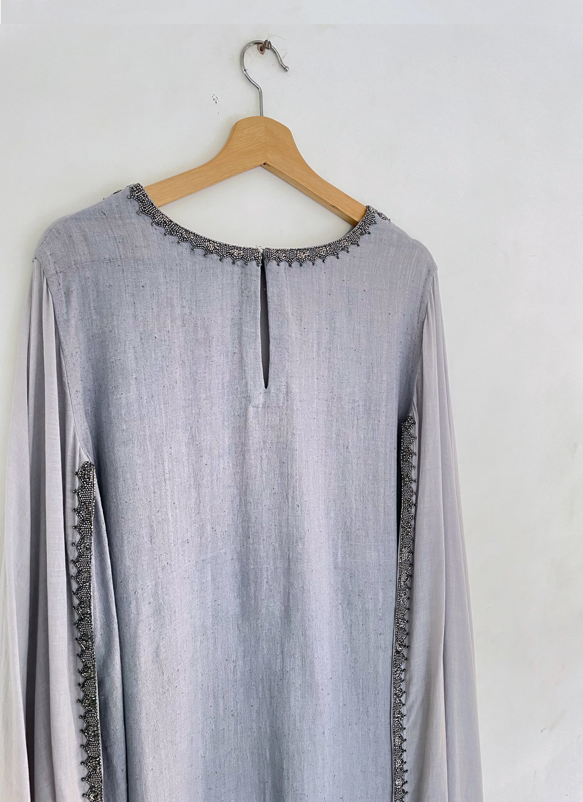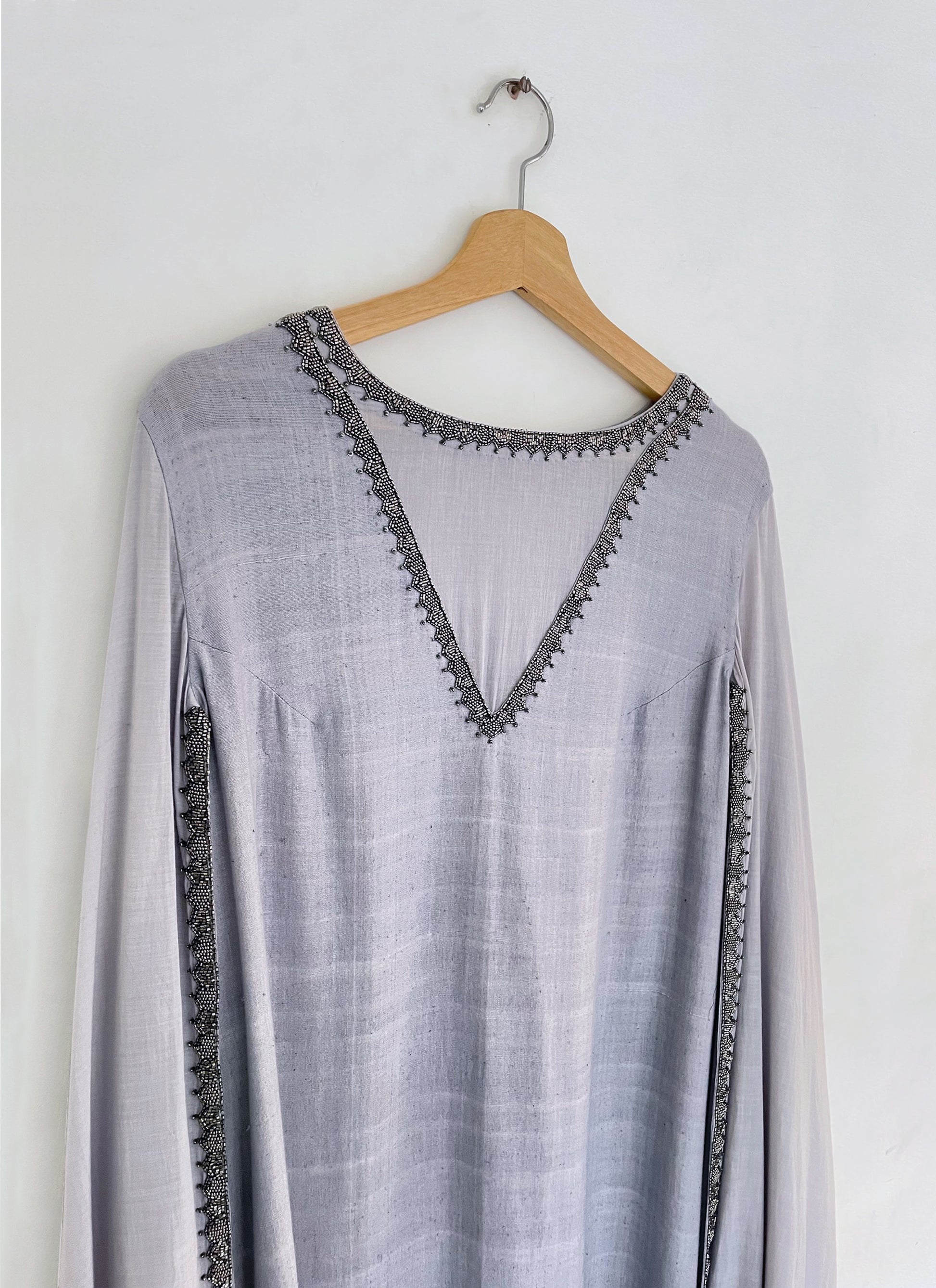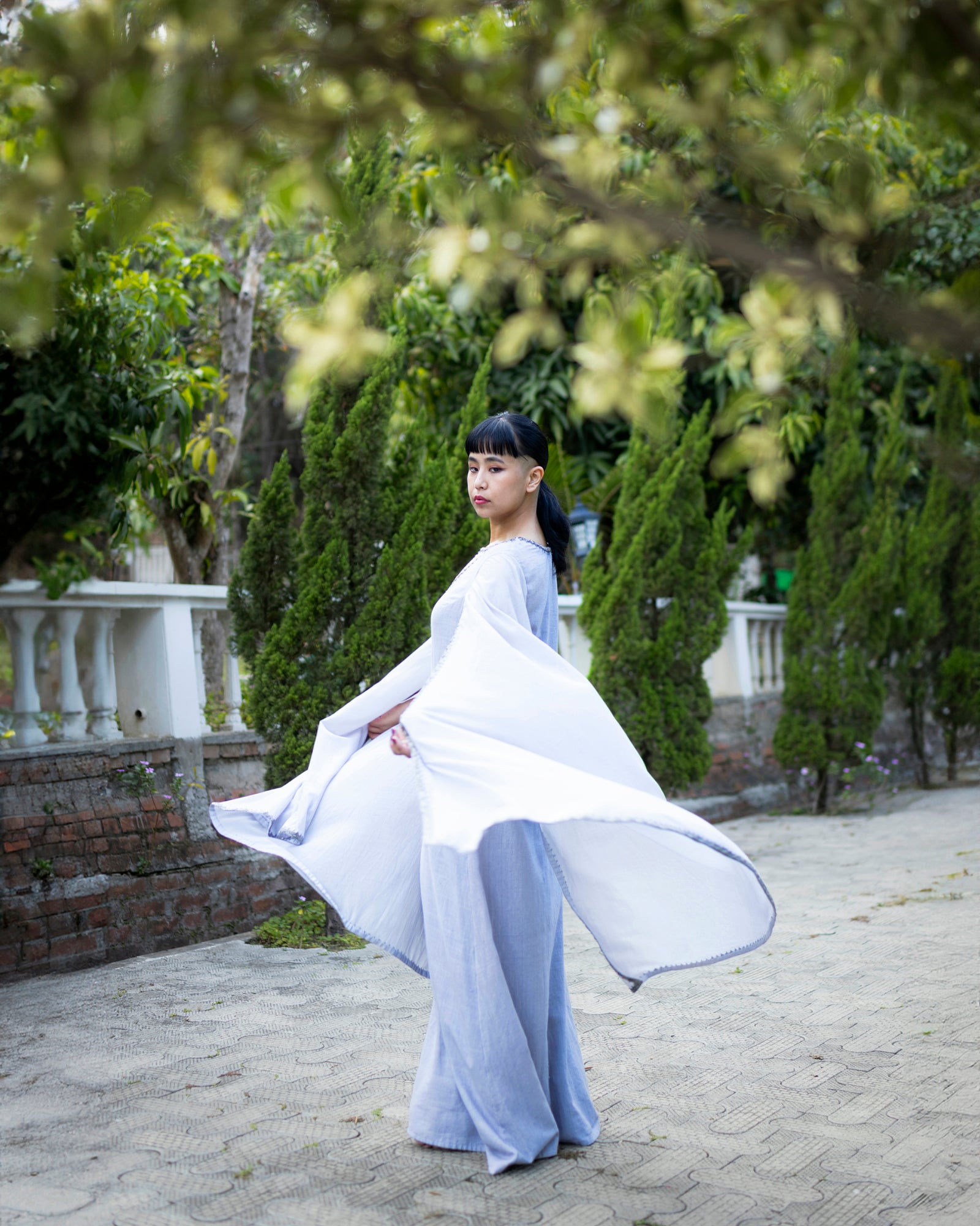 Valour is a flowing maxi dress, crafted from Khadi. The fine muslin cape sleeves drapes like soft butter, while delicate glass beadwork, shaped in the "Moirang Phijin" (Temple border) motif adorns the dress.