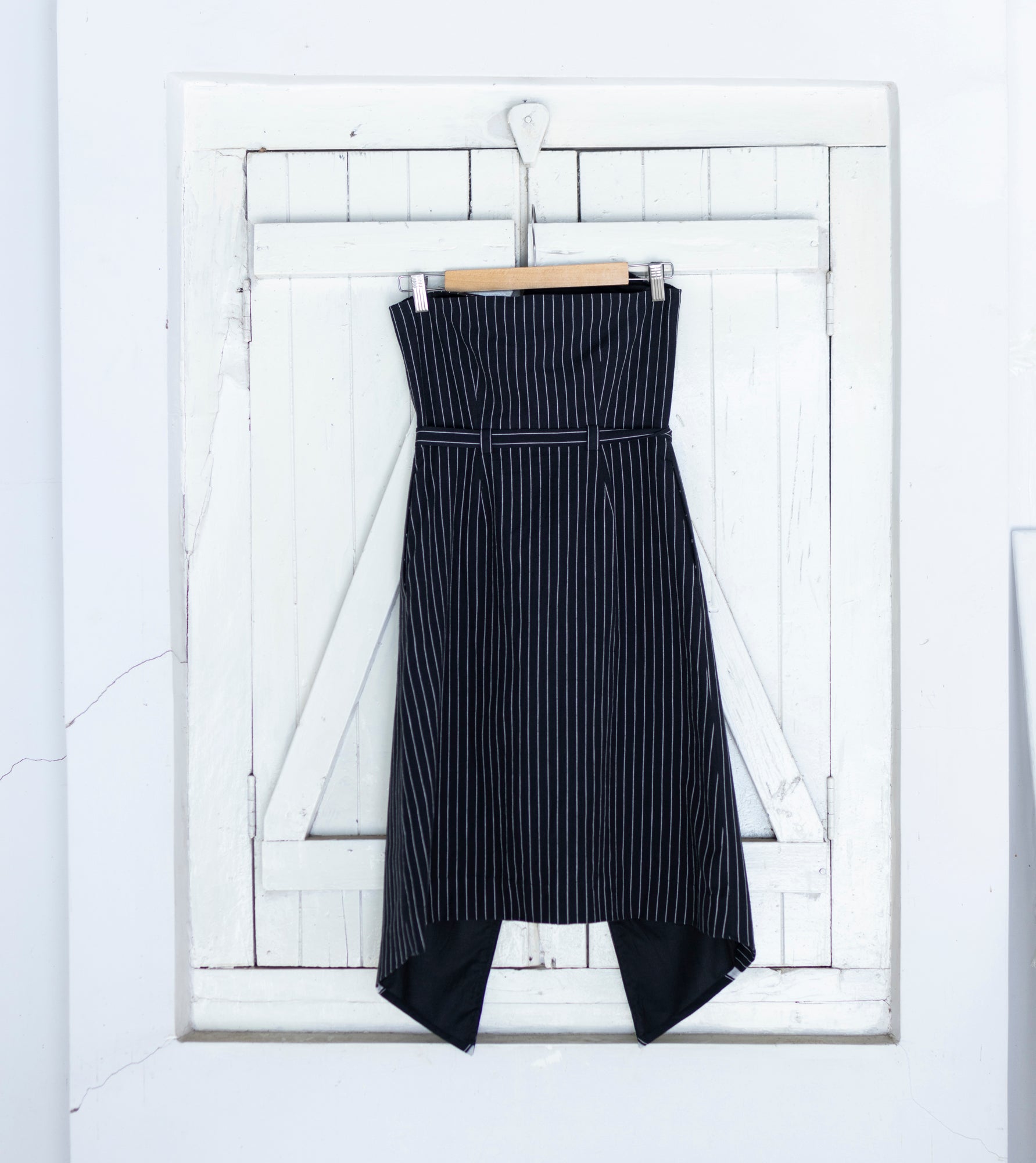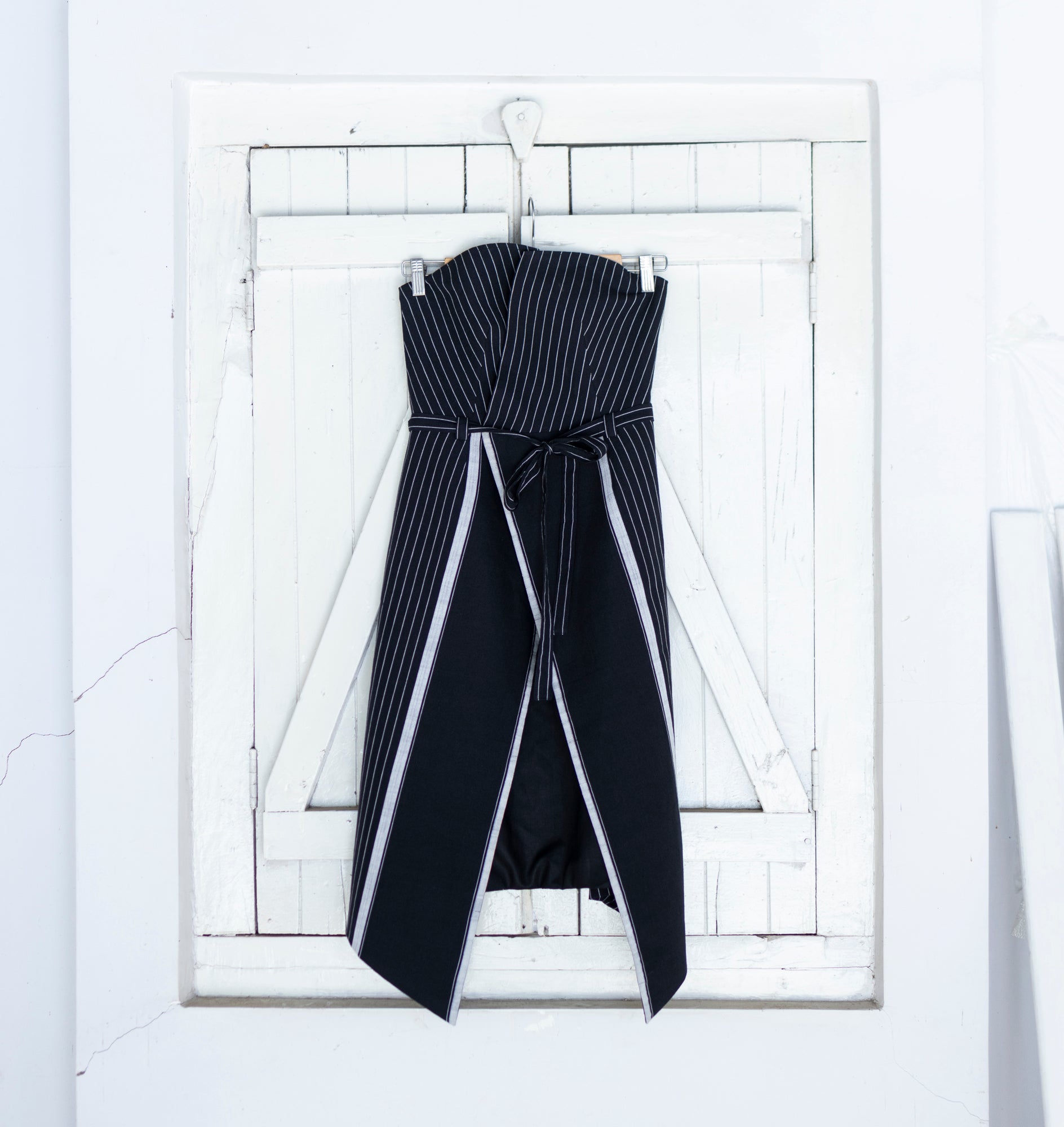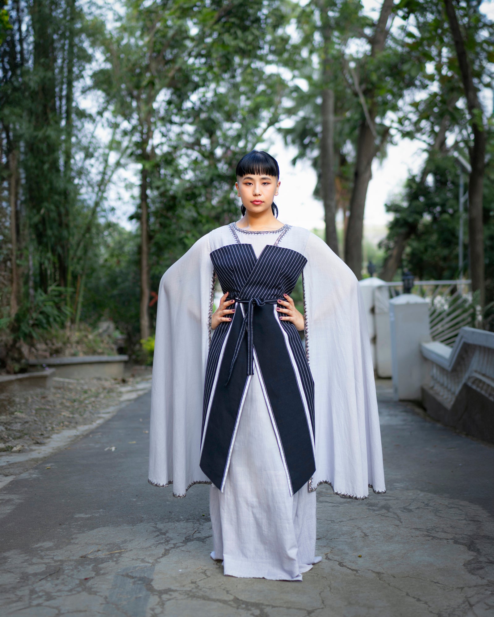 The Valour Bustier is a sculpted outerwear, forged from the handwoven cotton Kumjingbi fabric. With its sharp edges and the bold border of the Kumjingbi framing its form, it is a strong statement piece. A piece that stands firm, lending strength to even the most unadorned of outfits.