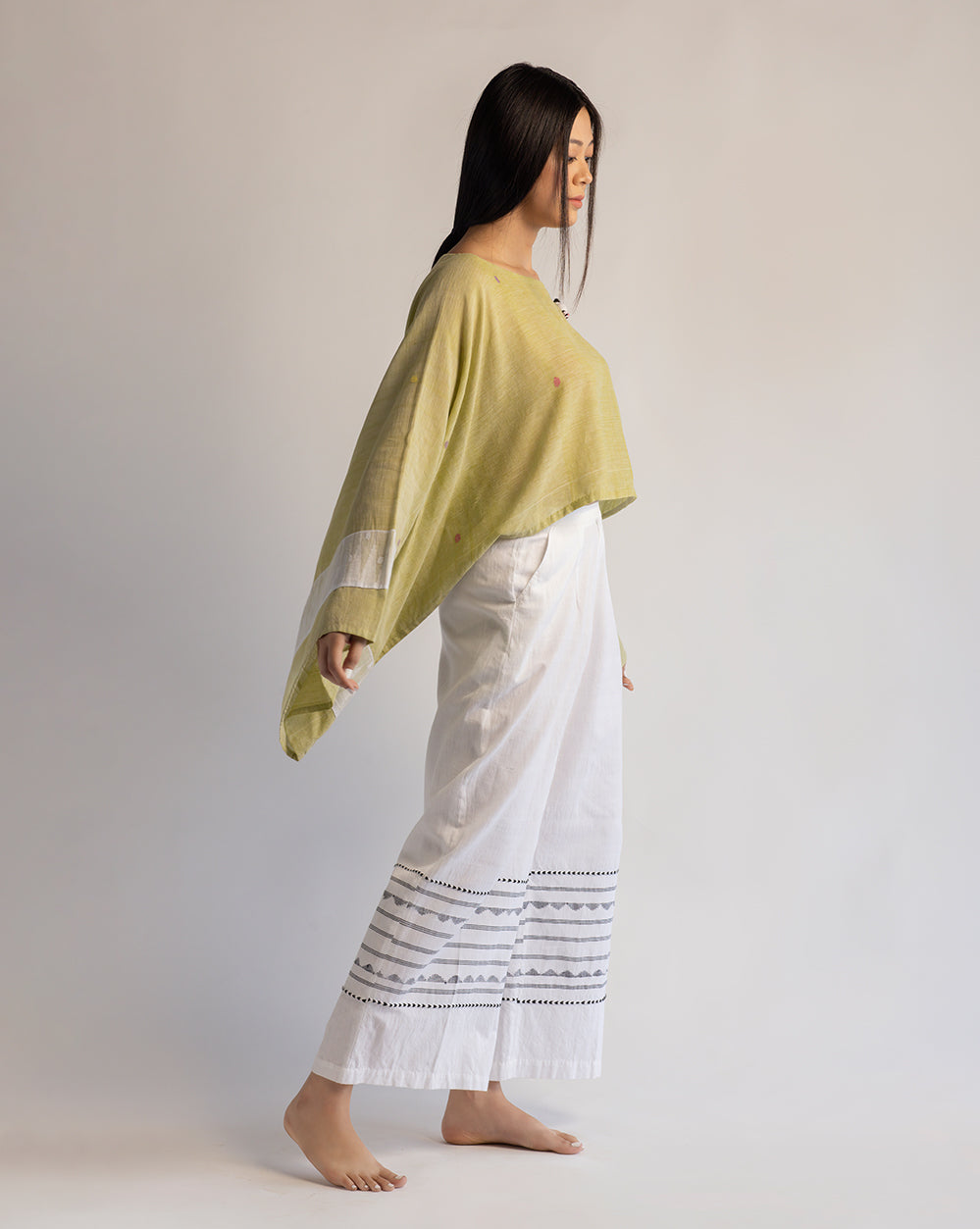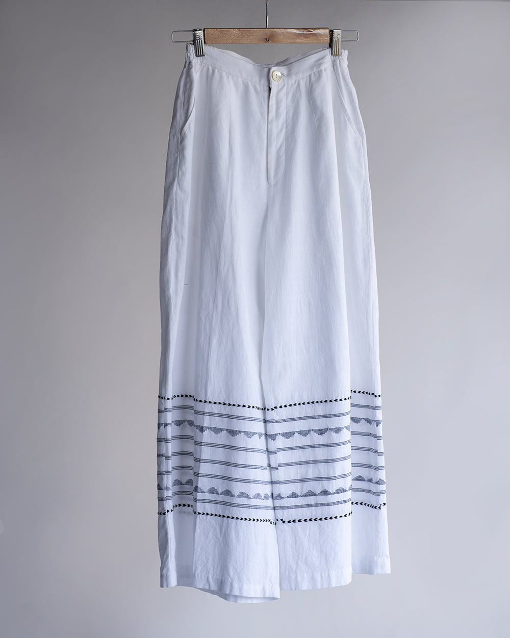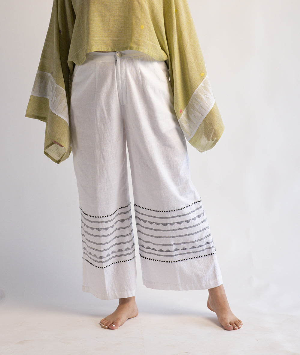 The White Chalk Pants showcase hand braided details against a soothing white tone. These comfortable handwoven Cotton pants feature an elasticised waist with deep pockets on both sides.
