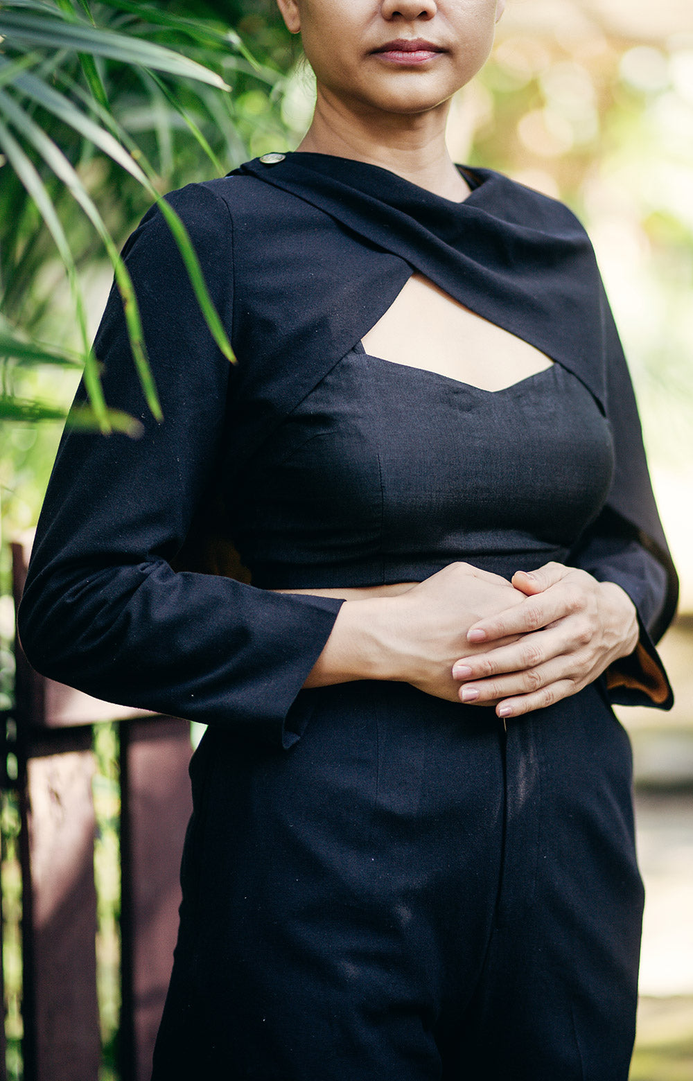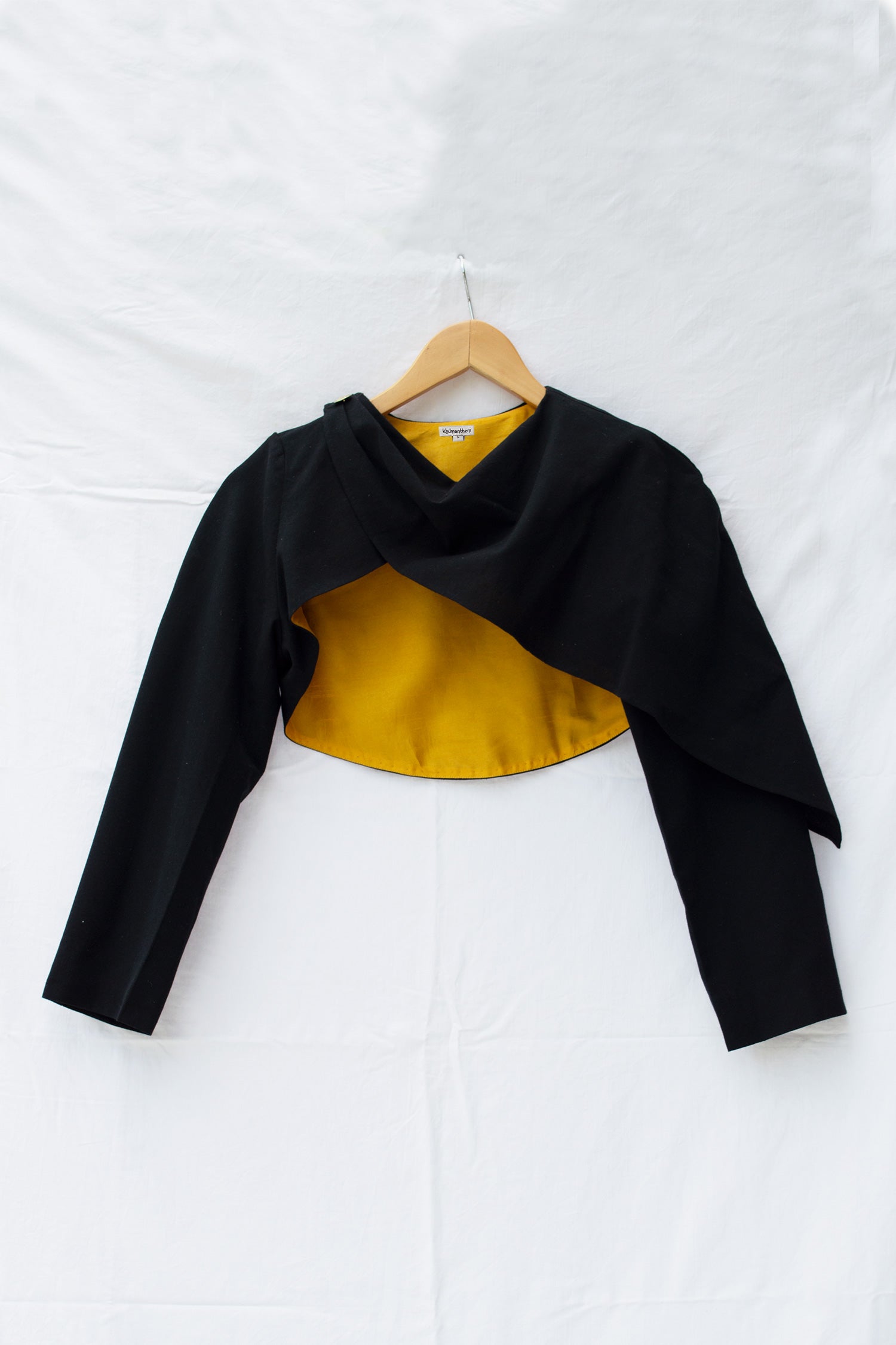 Handwoven cotton shrug with golden button. This shrug drapes like a scarf at the neck, adding a feminine grace to the structured fit. Contrasting lining in golden yellow adds drama to the piece.